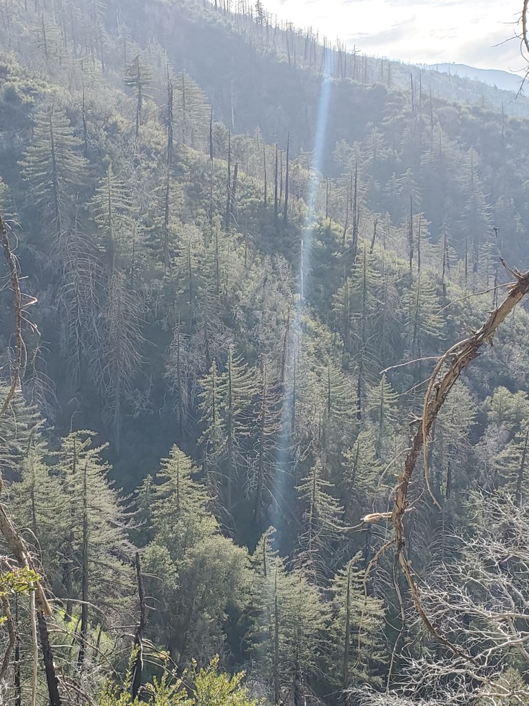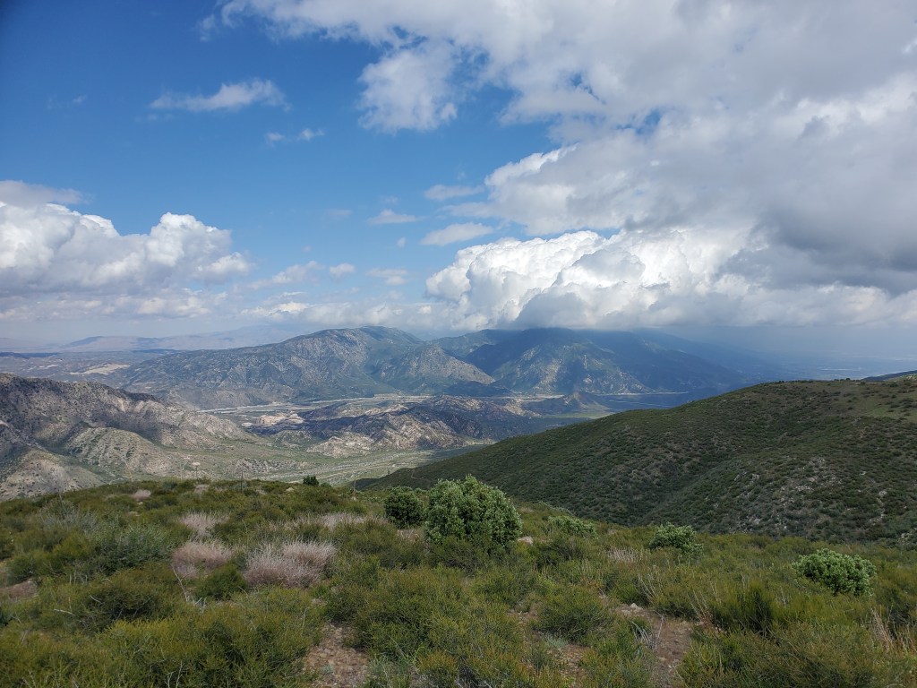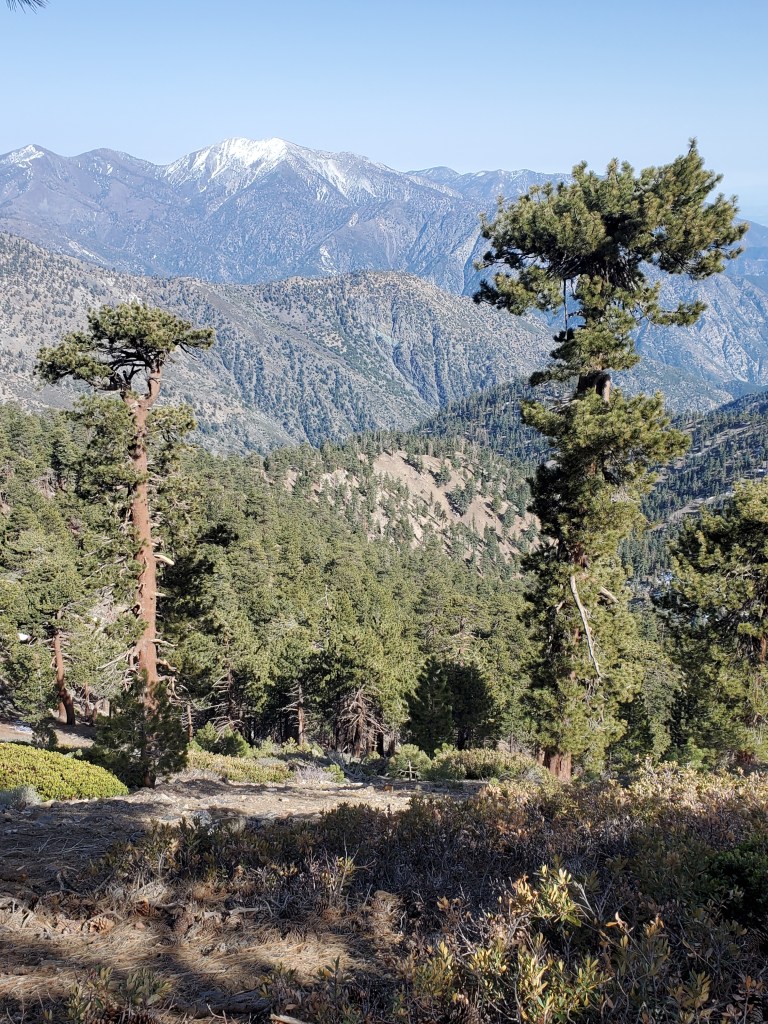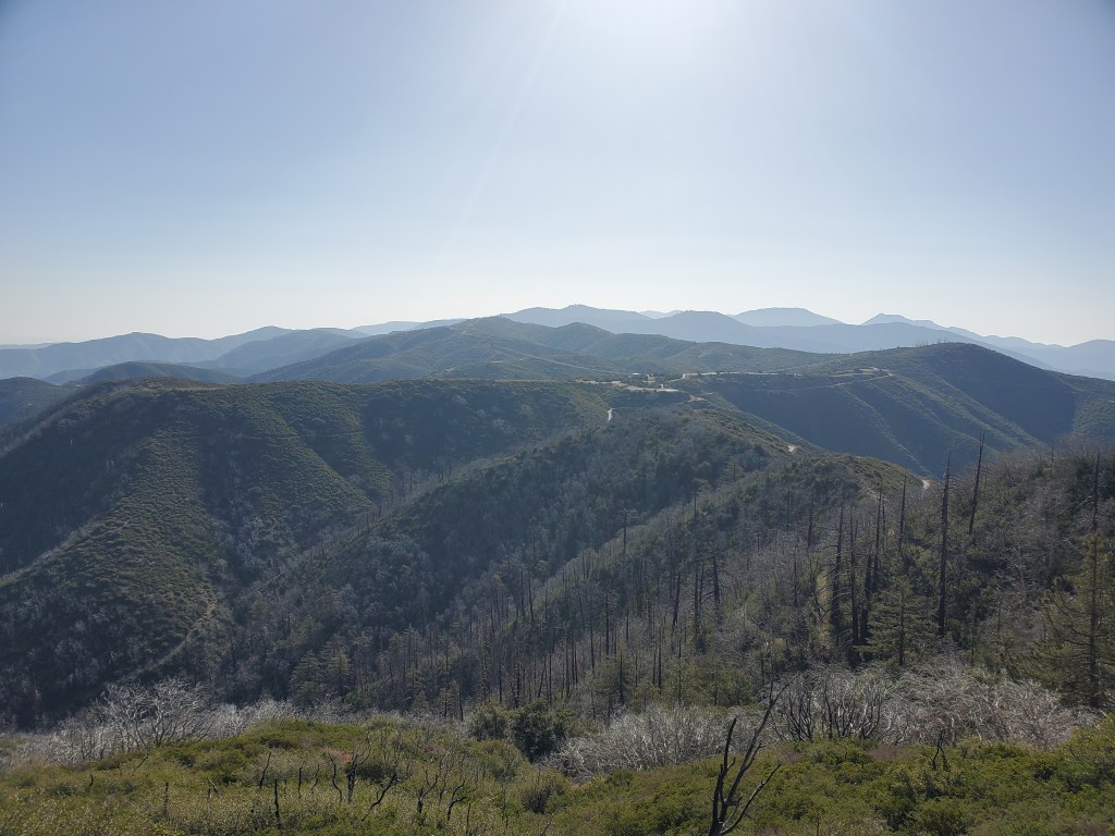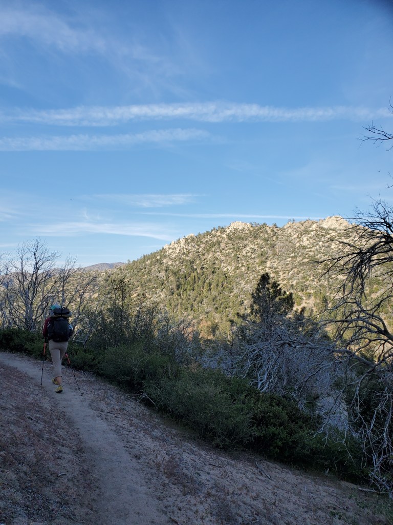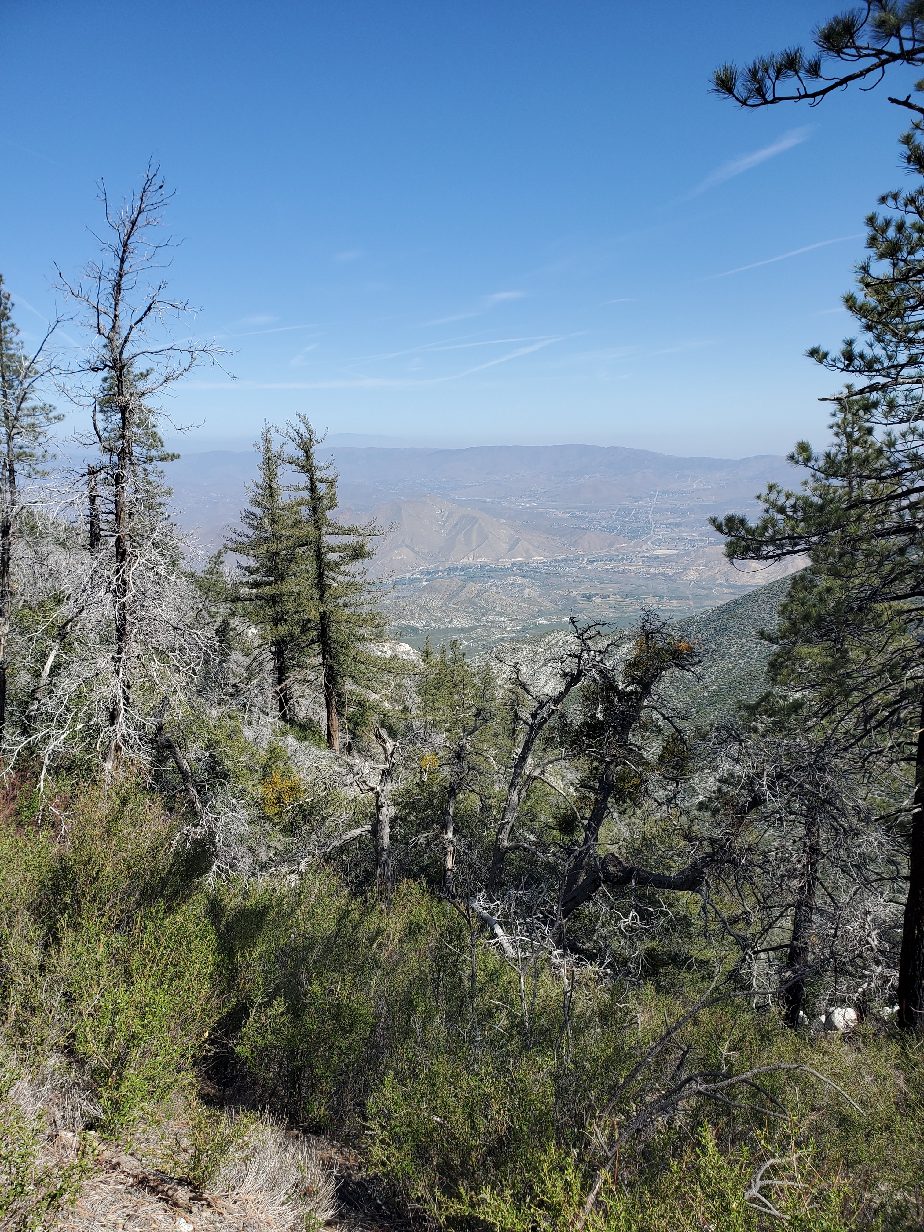 It was time to get off the mountain. A resupply box was waiting for us near Acton. The day ahead involved a few small climbs, but mostly descent, over 5,000 feet, as we returned to the valley bottom at 2,200 feet of elevation. We climbed up the side of Mount Gleason, again through mostly burned conifer forest. The views weren’t anything special, but we could see much of the ridgeline we had been traversing the last few days.