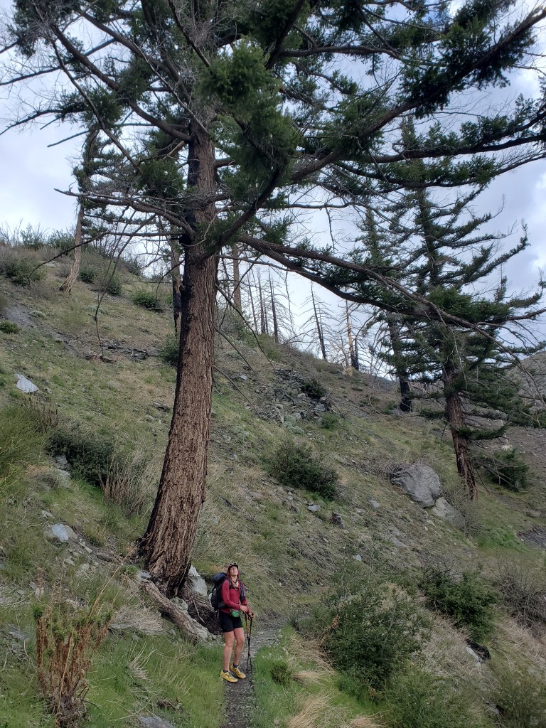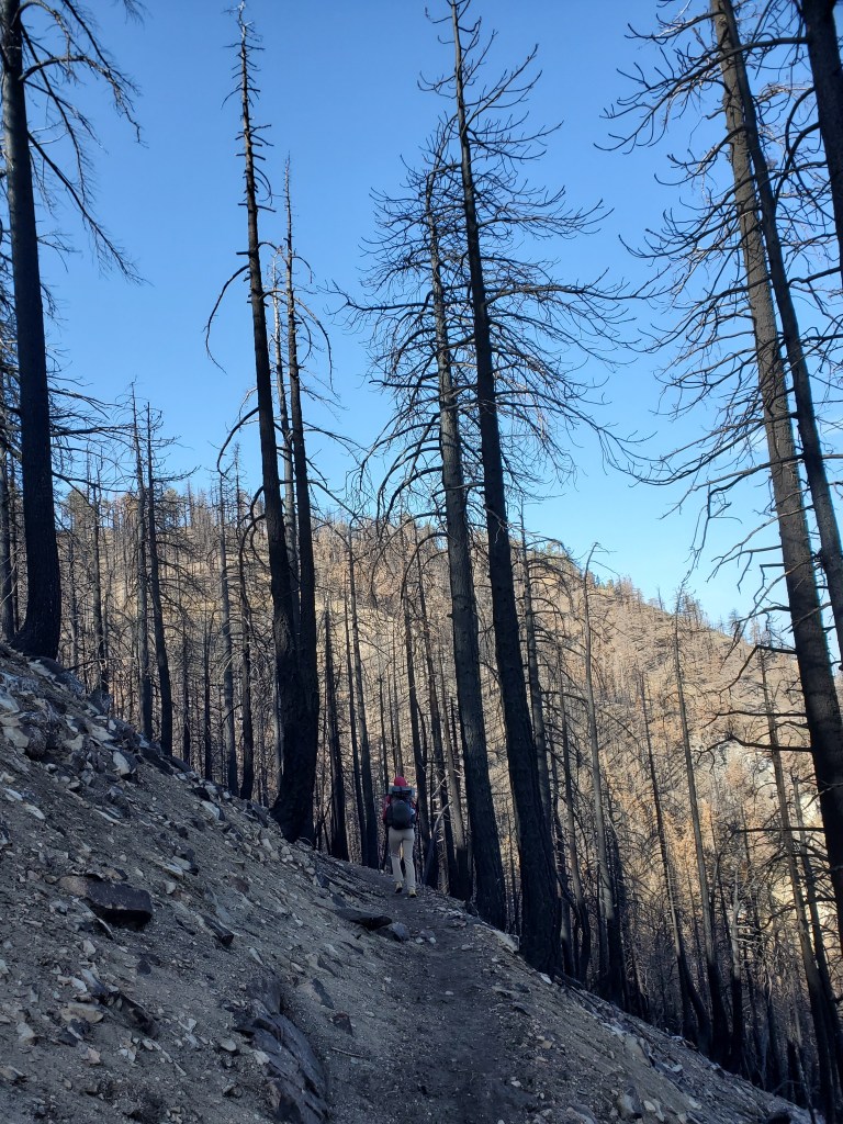 A few berries later, we were trudging up the mountain, 1,200 feet up over 1.7 miles, just like skinning up our beloved Ski Santa Fe. The trail doesn’t go to the summit, and we passed on peak bagging this day since we were aiming to go at least 20 miles total. The forest was very thin and open much of the day, ground cover clear, lots of blackened skeletons still standing, but plenty of big trees still kicking despite large burns around their trunks.