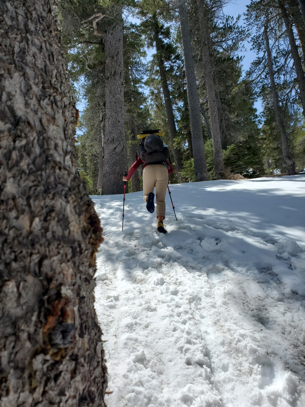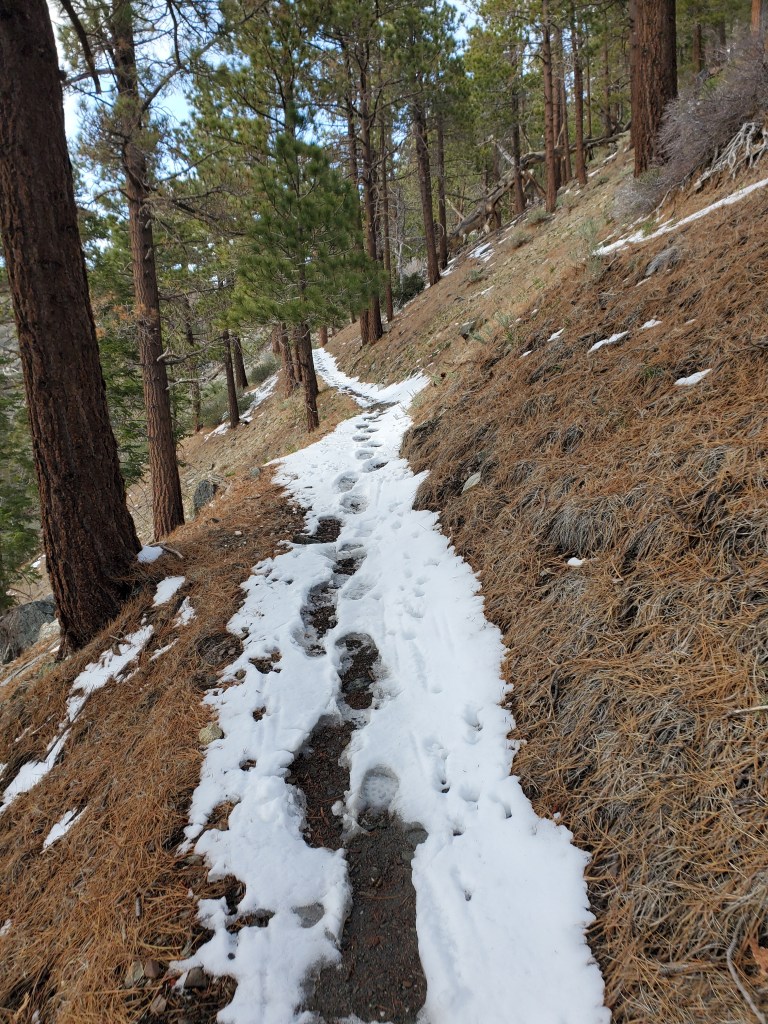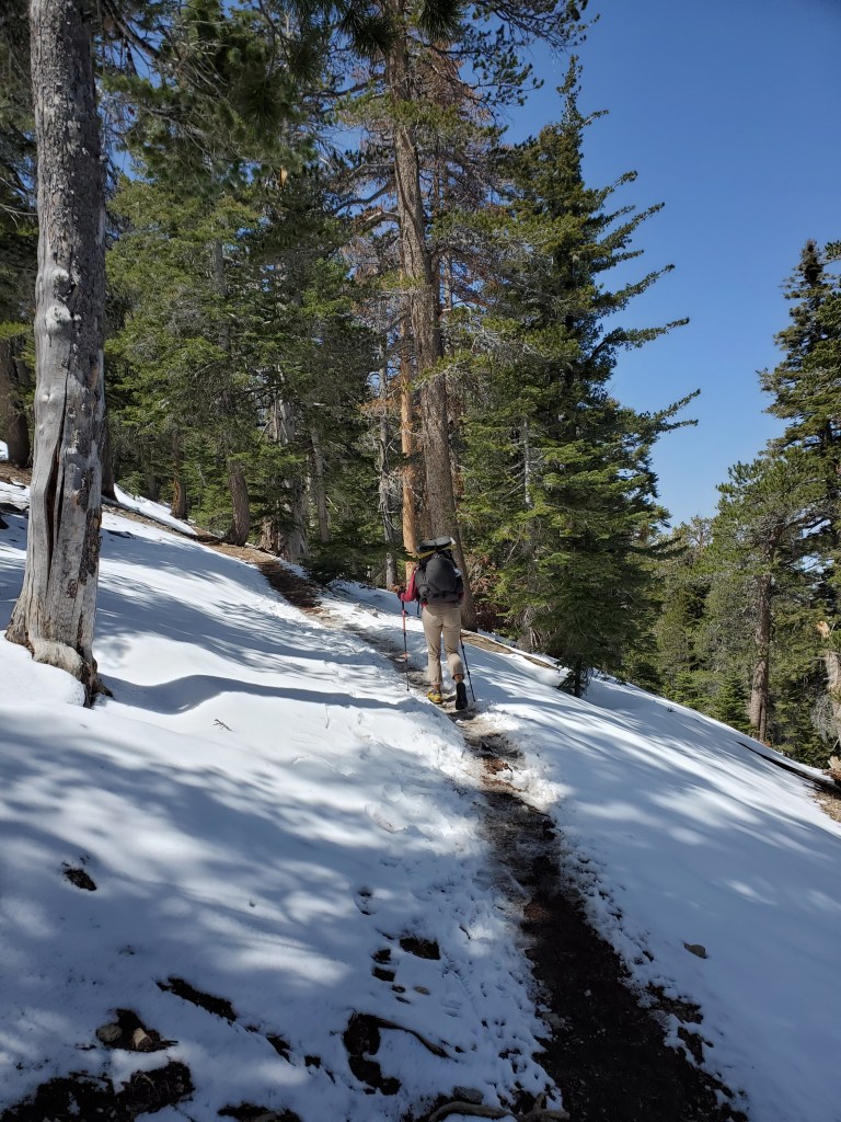We tried to wake up a little early, but again the cold and our tortoise like morning pace got us going at 8:10. I’ve decided our new motto is “You snooze, you cruise!” The day ahead of us would not be easy though. Mt. Baden-Powell was the next obstacle, standing at 9,407 feet. We knew from the views we got earlier of Mt. B-P that it had snow on it. Foolishly, Maggie and I mailed out our microspikes to Kennedy Meadows when we stopped in Big Bear Lake. We thought we were done with snow and there was no need to carry the extra weight. Well, we thought wrong…