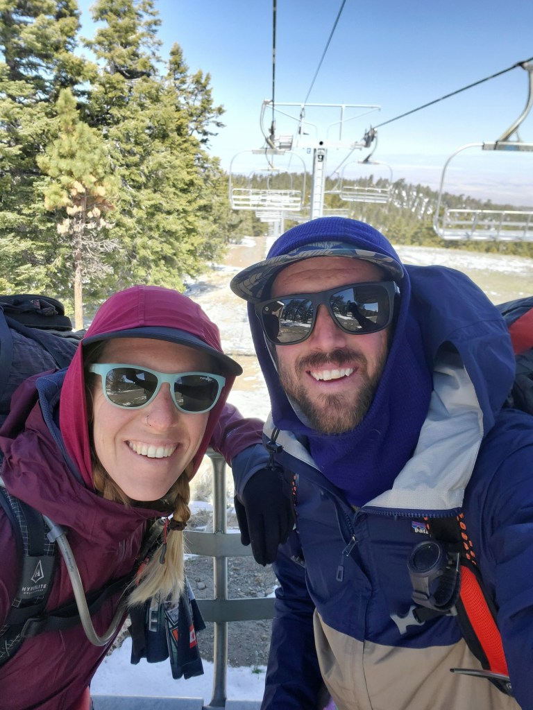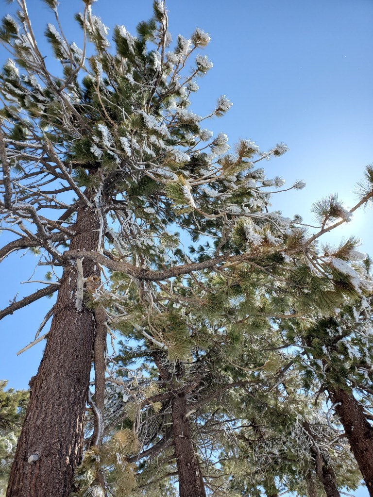Our effort the day before paid off, though, and the hike to Highway 2 only has some small ups and downs. The snow was pretty consistent, however, and we occasionally walked on a forest road that parallels the trail. Rime ice was encrusted on the trees, occasionally melting and sprinkling down like small shards of glass. An unexpected sight for Southern California in late April. We came upon a small ski resort, Mountain High. Despite the fresh snow, the resort was long closed for the season. We took pictures on the chairlifts and had a snack.