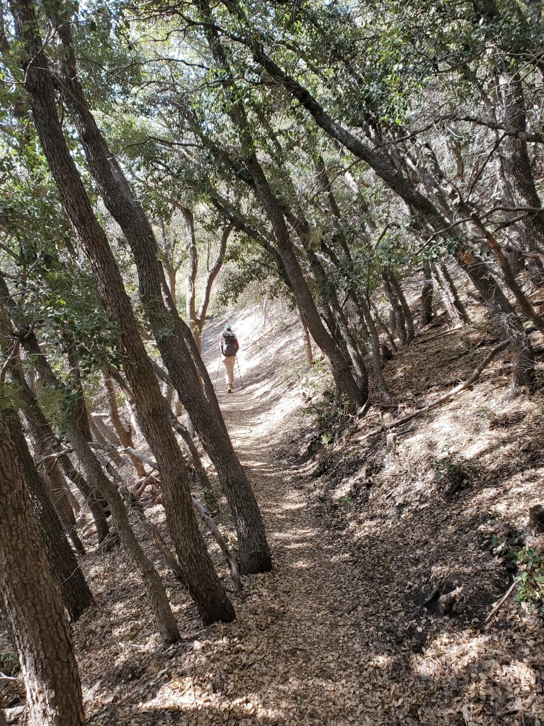We climbed back up on one last ridge for the day. More uninspiring shrubland and rolling hills for a while. We put on podcasts to break up the monotony. As we got a little higher and turned on to the north side of Little Mount Gleason, we were greeted again by Big Cone Doug Fir and some larger oak trees. They looked beautiful, back lit by the evening sun. Bright green grass grew in the damp drainages beneath the trees.