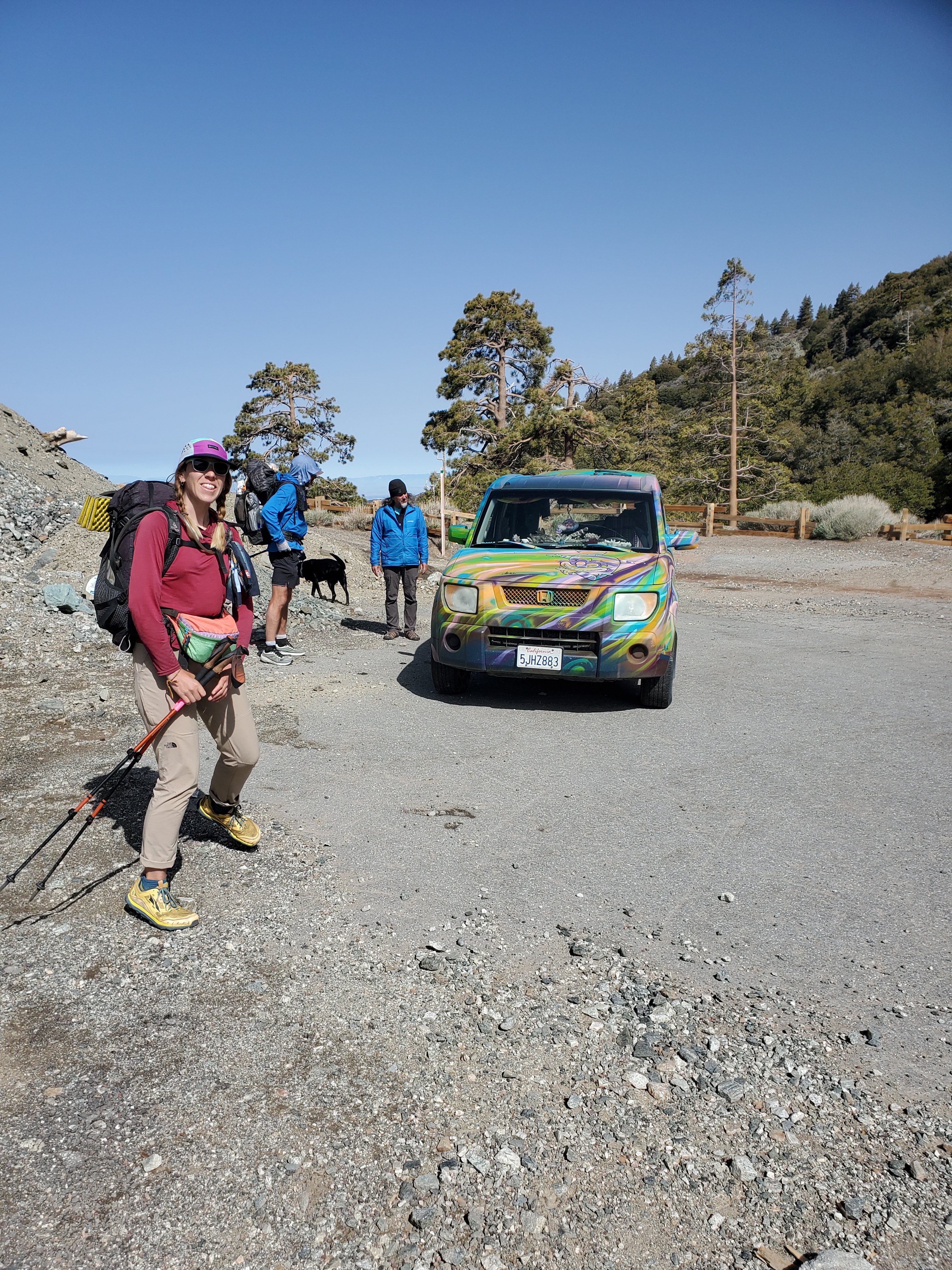 It was a breezy and cool morning. After a few easy miles, we dropped down 1,000 feet to the B-P trailhead. Waiting for us in the parking lot was a fabled trail angel, Cheshire Cat. He has a Honda Element custom painted with the Cheshire Cat from Alice in Wonderland on a bright rainbow background. He was offering up fresh fruit! I got a banana and Maggie got a quarter pineapple- perfectly ripe! We had 2,800 feet to climb over 4 miles, so we ate quickly and started our way up the mountain. This was noticeably steeper than most of the trail before, so we kept our pace slow and steady. There were a couple small snow patches on the trail, a warning of what was to come. We took a water and snack break with the Wolf Pack half way up.