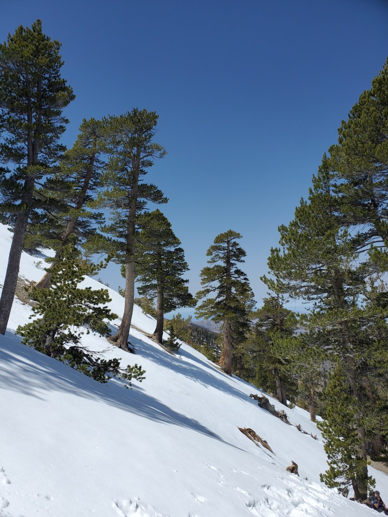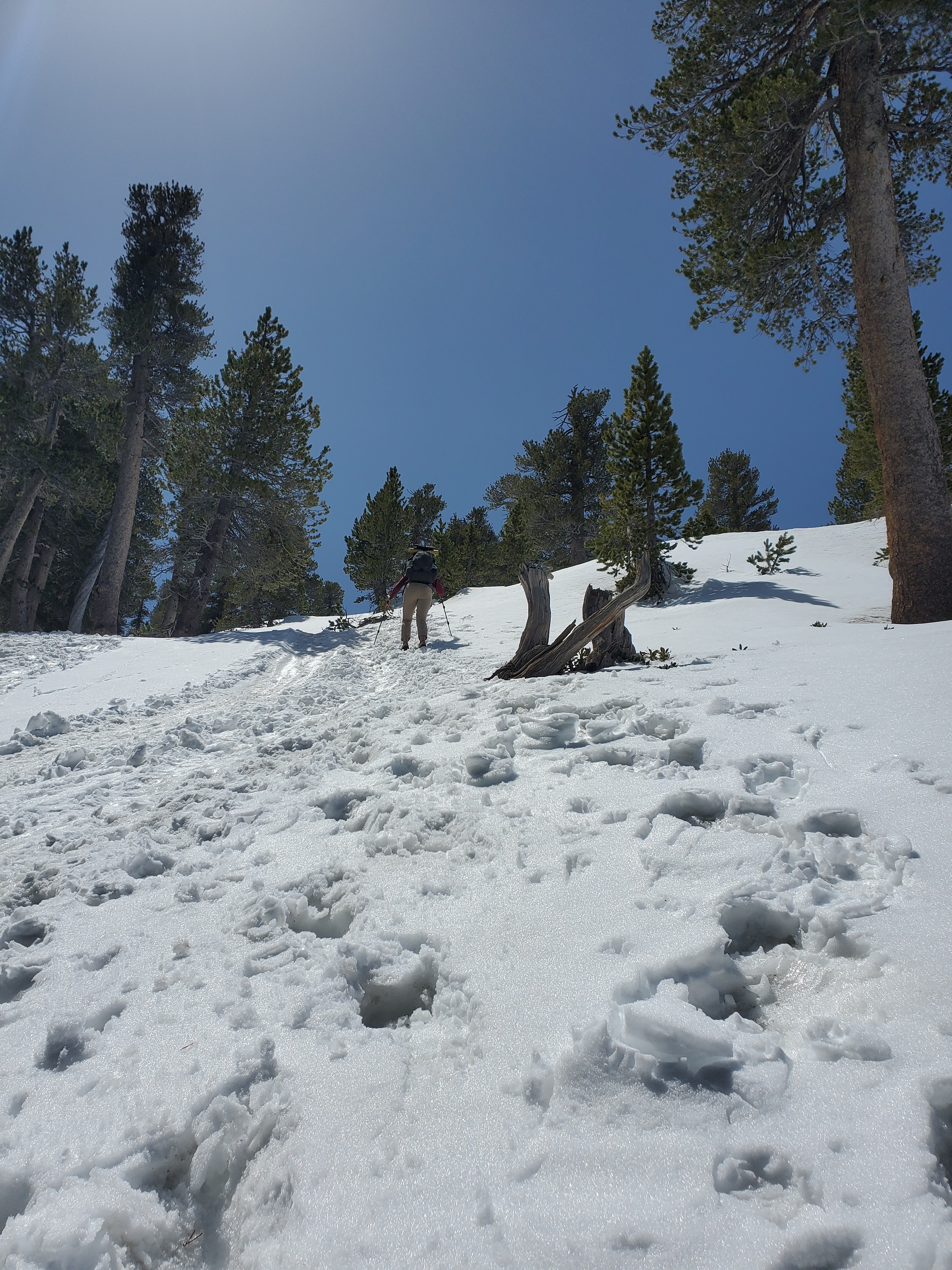 The snow became more or less continuous above 8,500 feet. It didn’t help that the trail approaches the summit on a north east aspect, protected from direct sun. The snow was mostly ok for waking across in our trail runners. It was about noon, and the snow was softening up, which made kicking in steps a little easier. The slope angle picked up and we were wishing we had our spikes. We both had a few small slips where we briefly lost footing, but we never fell down, thank goodness.