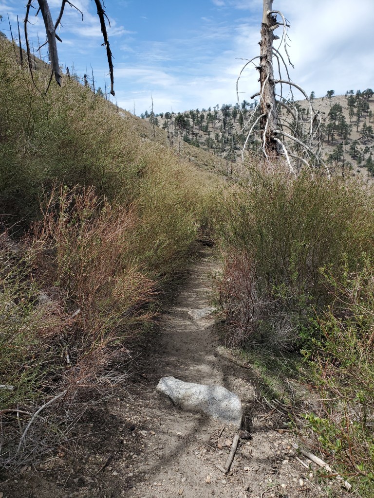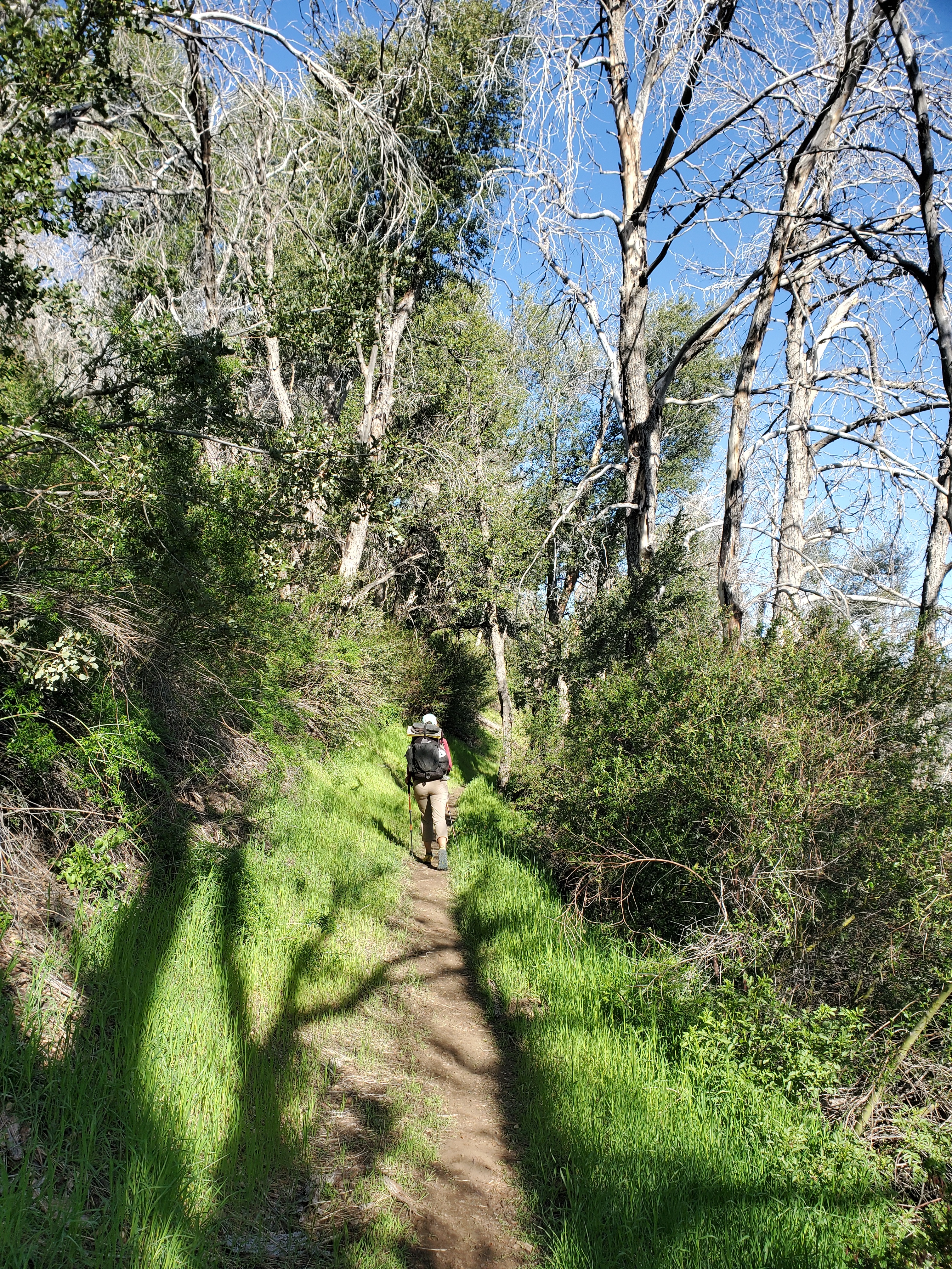 The scenery was nothing special, back in the desert scrub with the occasional pine tree. We got water at a small stream, and as we talked, it was feeling like a bad day lay ahead of us. If we couldn’t hike 20 miles, it would throw off our plan to get to Acton the next day. There was minimal water on this stretch, complicating things a little more. We walked, mostly in silence. At times, the thorny shrubs on the side of the trail were overgrown, but we were prepared for this with long sleeves and pants.