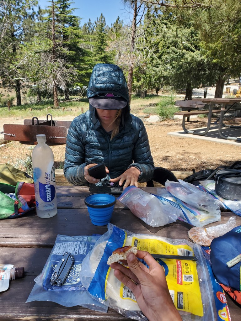 We dropped down to Hwy 2 to get a ride into Wrightwood for our next resupply. This is a winding, scenic road without much traffic, so it was out longest wait yet. The crowd of thru hikers slowly grew as we waited. A day hiker coming off of Mt. Baden-Powell saw the mob and offered a ride to four of us. Maggie and I hopped in with an older British couple we have been seeing periodically, and we got to town. First stop: the brewery. Somehow the Wolf Pack beat us there, despite getting a hitch after us. We enjoyed a couple local brews and sandwiches for lunch. We all made way to the hardware/gear store. I was in need of new socks, and a couple other hiker odds and ends. Groceries next. Our friends have been jealous of the produce, cream cheese, and bagels we pack out, so they were watching our cart closely for inspiration. We took some burritos to go from the local Mexican restaurant, then went to top off our water. It was getting late, almost 6pm, and we intended to hike a little more that evening. Sitting in the convenience store parking lot, s nice old woman named Joy approached us and asked if we needed a ride. Good luck strikes again! We got back to the trail and considered our options. The trail crosses the highway at a view point with benches and bathrooms. Our burritos weren’t exactly backpack friendly, and the sun was going getting low. Hiking some more was quickly ruled out, and instead we camped a few hundred feet from the road, eating dinner while the sun set over L.A. Our tent site was a bit slopey and the wind picked up over night, but it was entirely adequate, and we slept well after reading our books.