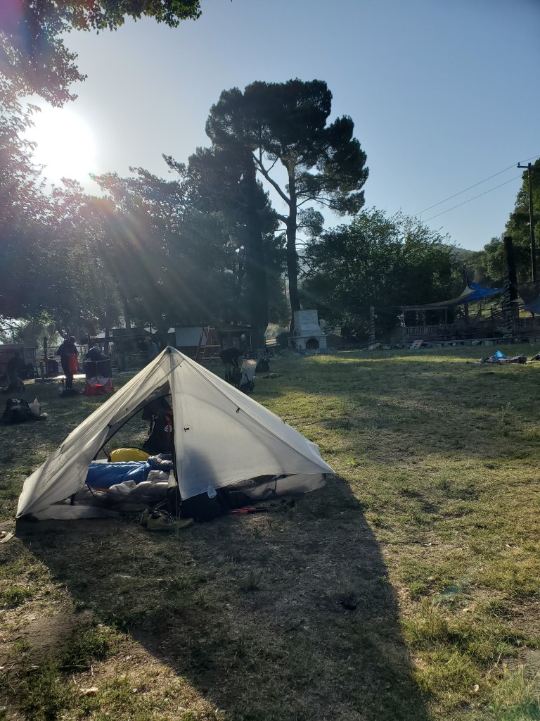 It was a quick road walk to LA RV Resort where we checked in to camp for the evening and pick up our resupply package. We went out to set up camp and found… the bubble. Close to 50 hikers were milling about, tents with laundry hanging on top to dry. We were lucky enough to grab a washing machine without too much of a wait, and we showered up. We ordered pizza, caesar salad, and a bottle of chardonnay. Tired from three 20-ish mile days, we decided to retire rather than socialize. The chatter died down a little after 9 as everyone crawled into their tents, synthetic materials swishing and crinkling all around as the hikers got comfortable.