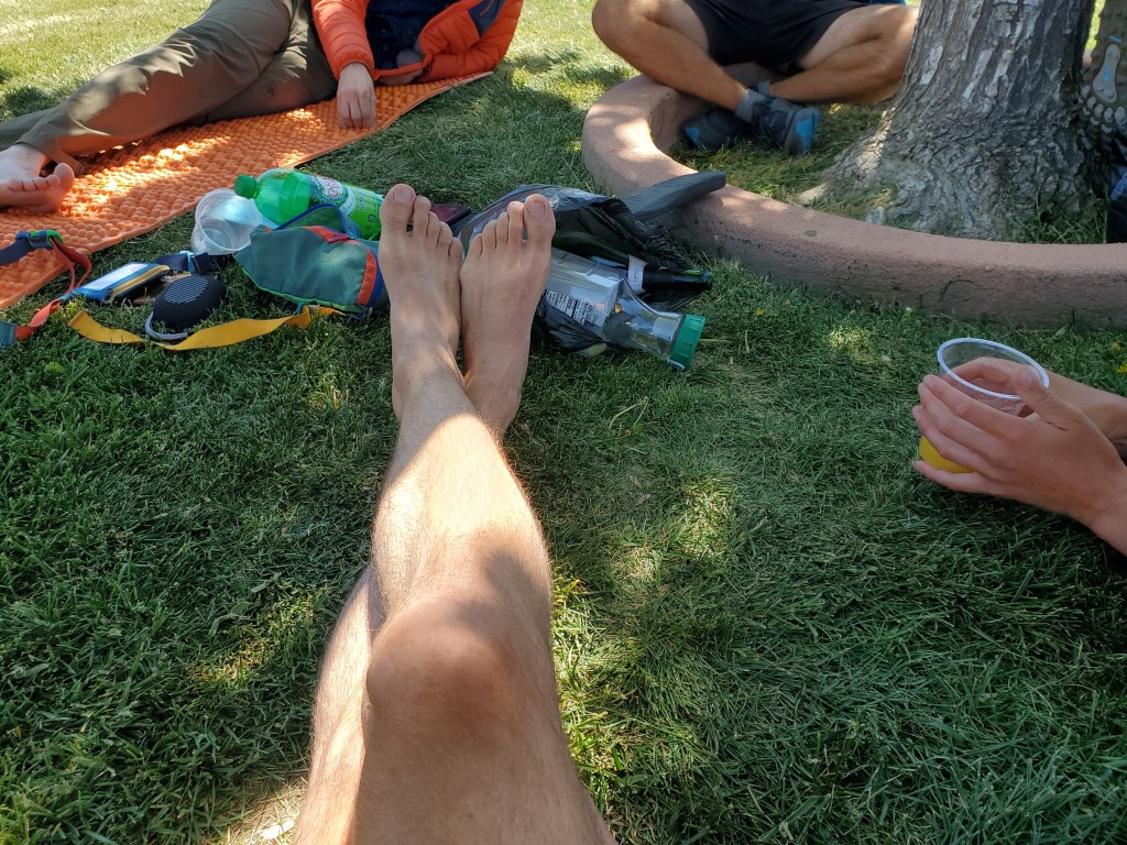 Maggie and I sat in the railyard park grass with the Austrians for 4 hours. Being the day of birthdays, we started drinking mimosas. A few other hikers sat with us after awhile.