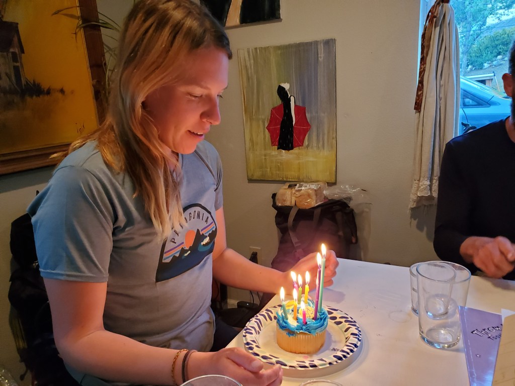 Rachel picked us up at 4pm and took us, the Austrians and two other wayward hikers to her home. We met her family, got the house tour, and she told us to relax while they made dinner. We had sausages/fish, mashed potatoes, and veggies. At this point, all six of us hikers were overwhelmed by the generosity we had received, but it wasn’t done yet. It didn’t take long after plates were cleared for birthday cakes to come out for Maggie and Stardust!