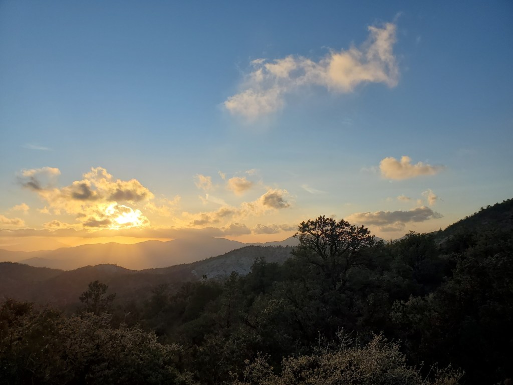 We crossed Highway 58, the bottom of Tehachapi pass, and climbed up the other side, taking frequent breaks with our weighty packs. The wind picked up even more, pushing us from side to side, slowing progress. We made it up higher yet into the pinyon forest and got some blockage from the wind. Maggie and I found a nice nook to cowboy camp in. The Austrians kept going a few miles, so we camped alone. The clouds and the sun put on a show for us as the day ended. We watched for several minutes, bundled up in most of our clothes.