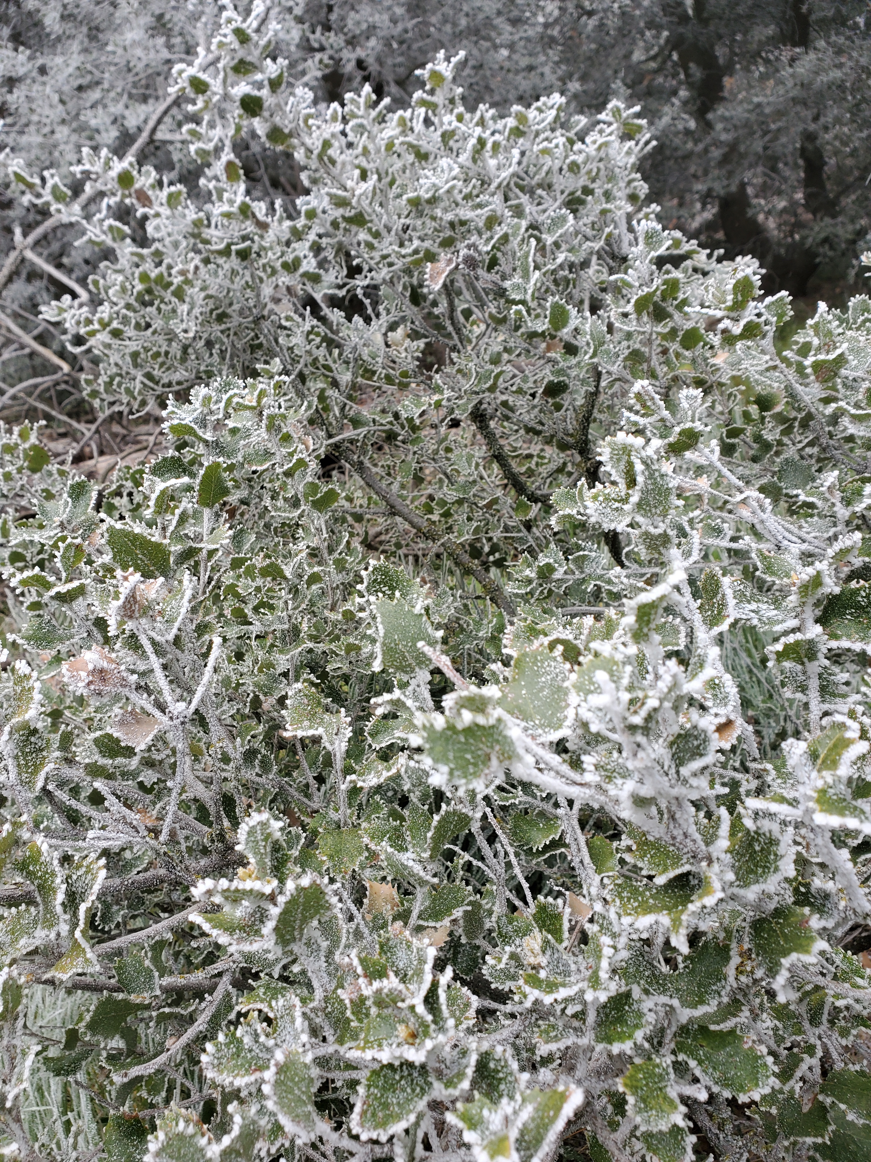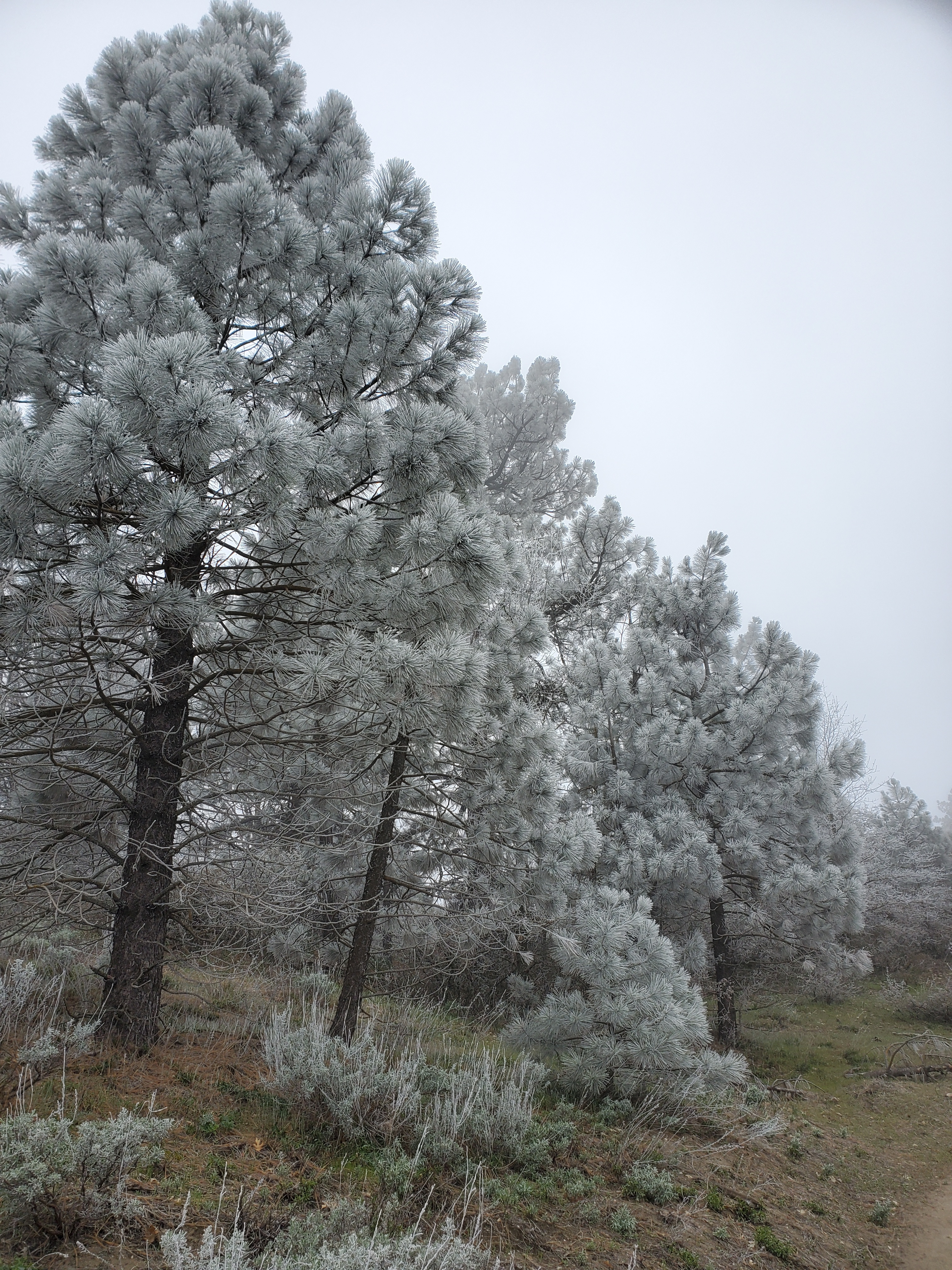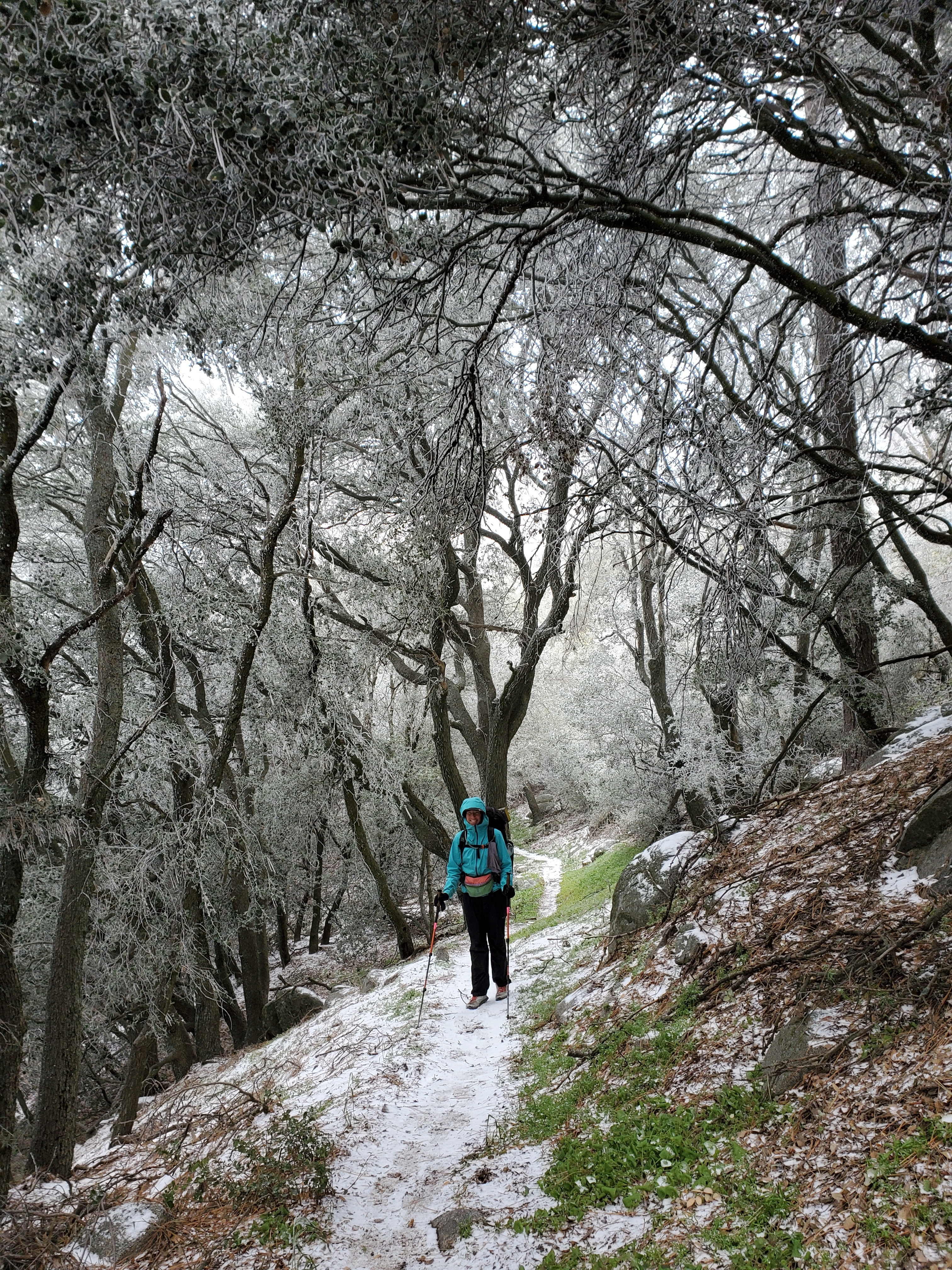 We stopped for water and lunch at 11:15 and the sun finally came out. Rime kept falling from the trees so it still looked like it was snowing at time. The trail took us into open pine forest with outcrops of granite boulders. It was easy, flat terrain, and it felt like a completely different day than the one we woke up to.