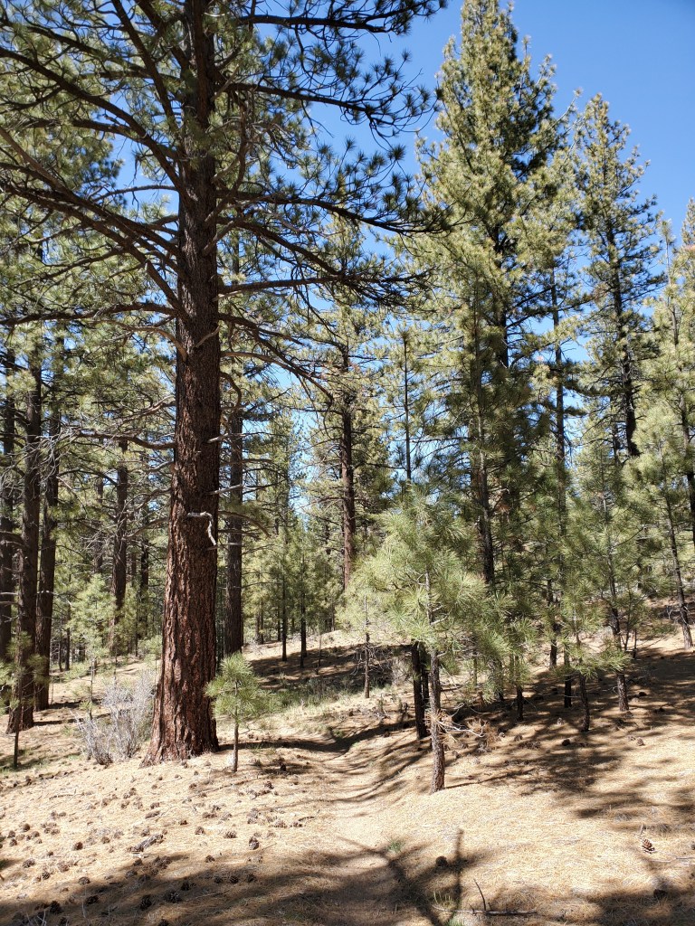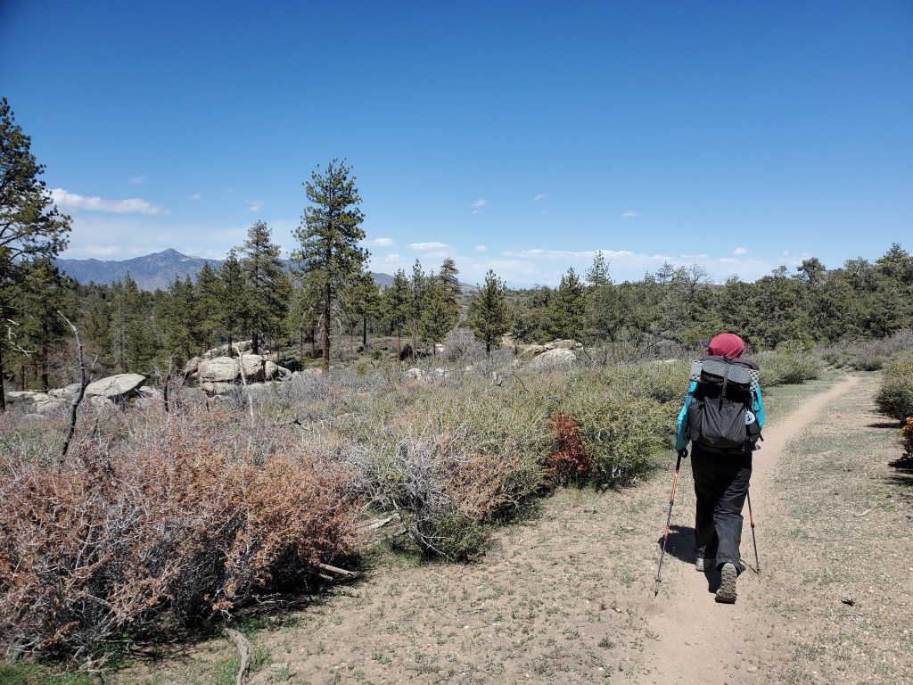 We slept in and enjoyed a slow morning. We knew we had an easy day ahead, so we got on trail at 9:45. The wind was still blowing strong. We started off wearing most of our layers. The trail weaved through pleasant pinyon forest for several miles, which helped block some of the wind. It was nice to take short breaks and warm up in the sun. The forest gave way to scrub oak and the trail joined a dirt road. This was a particularly boring couple miles. We hiked quickly to get it over with and eat lunch. The only thing of interest was that, even though it felt like we were much lower in elevation, we occasionally got a view down to the Mojave a few thousand feet below.