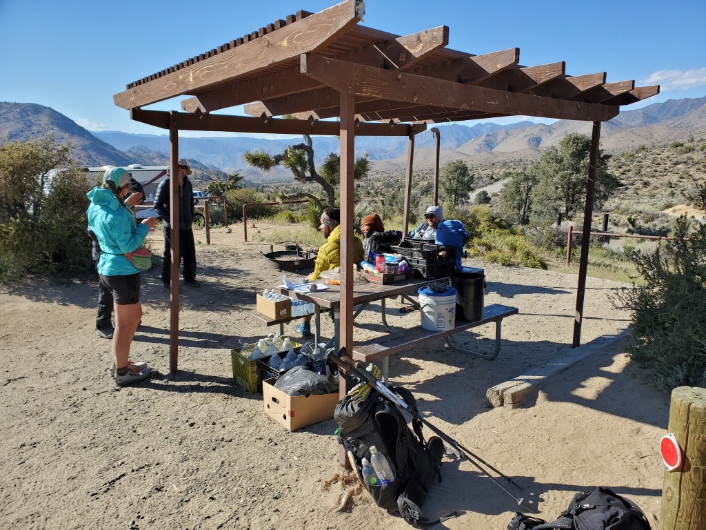 We examined the spread and soon after an old man wearing a Vietnam veteran hat came from the trailer. He introduced himself as “Possum” and told us to take whatever we like. “My son is heating up water for coffee and hot chocolate, it should be ready in a few minutes,” he said. This was exactly what Maggie wanted to hear. The son, “Jumnaji,” had hiked the PCT a few years prior. The two of them had been at Walker Pass providing trail magic for over a week! Their plan was to drive up along the trail throughout the summer and do the same as the hikers moved north. We indulged in a grapefruit, candy, and of course a coffee for Maggie. We chatted for a little while then went and found our campsite 30 yards away.