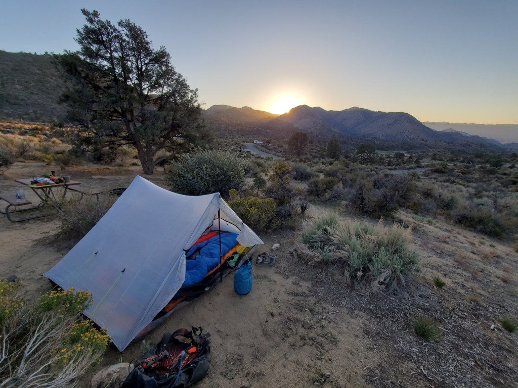 After lunch, it was only 7.5 miles to Walker Pass campground. We cruised down, not taking many breaks because we were eager to be done well before sunset for once. The pinyon rejoined us for a bit and we got a view down to the pass below. So down we went, back into the proper desert again. We were done hiking at 4:45pm! We signed the trail register at the turn off the campground, then wandered in to find a place to set up camp. The first campsite had a white Cadillac truck and a 20 foot trailer. Obviously taken we almost passed it by without a second thought, but their picnic table had lots of water jugs. I peered for a closer look and saw fresh fruit and boxes of poptarts – this was definitely trail magic!