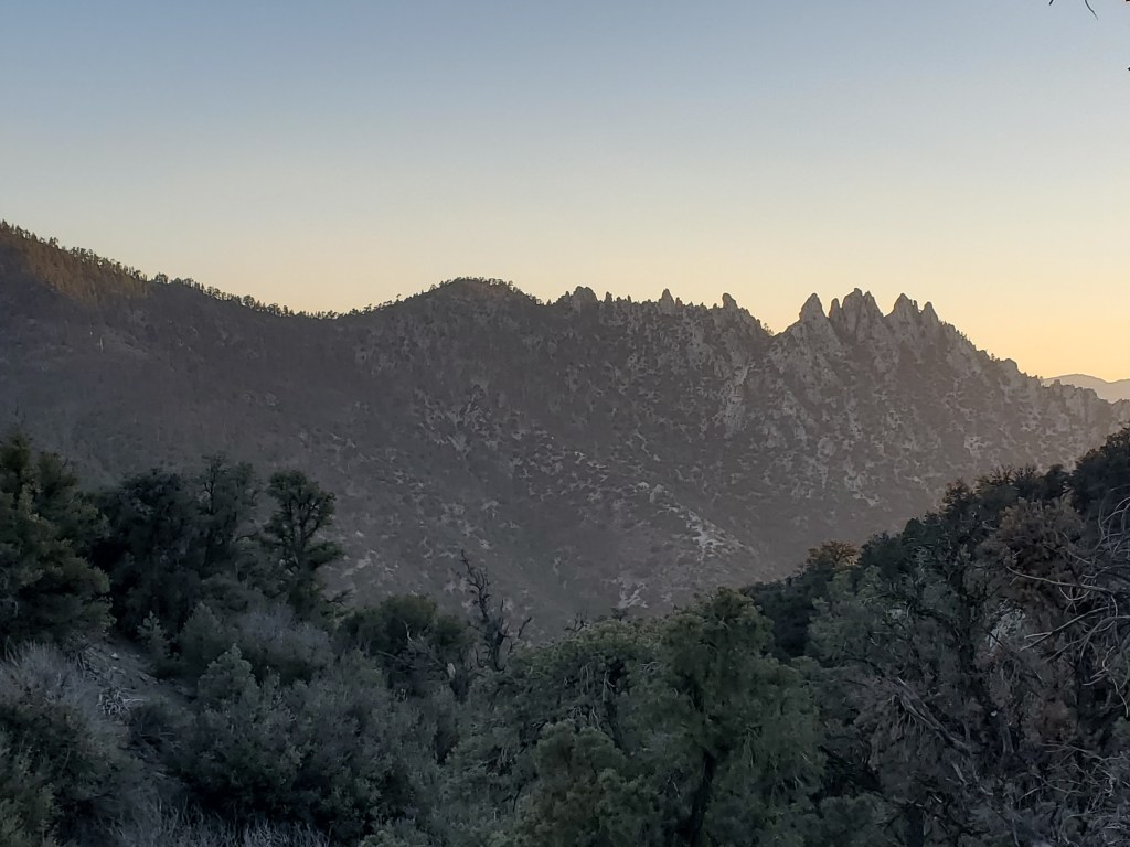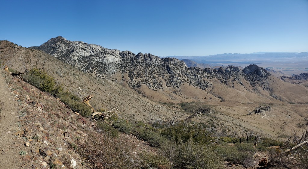 My pad deflated again in the night, but it was a slow leak. Seems it’s only a matter of time until inflatable pads quit holding air, and that day comes sooner than you might think with daily use around pokey pine needles and sharp pebbles… Luckily we have some foam pads we use for sit pads, which help keep my boney hips from getting too sore on the cold, hard ground while sleeping. We tried to get up at 5am, but we snoozed for an hour, so back at it around our usual time around 7:50. We hiked around Jenkins and Owen’s peaks. Owen’s peak showed off its craggy white granite ridgeline, hinting that the Sierra Nevada are not far.