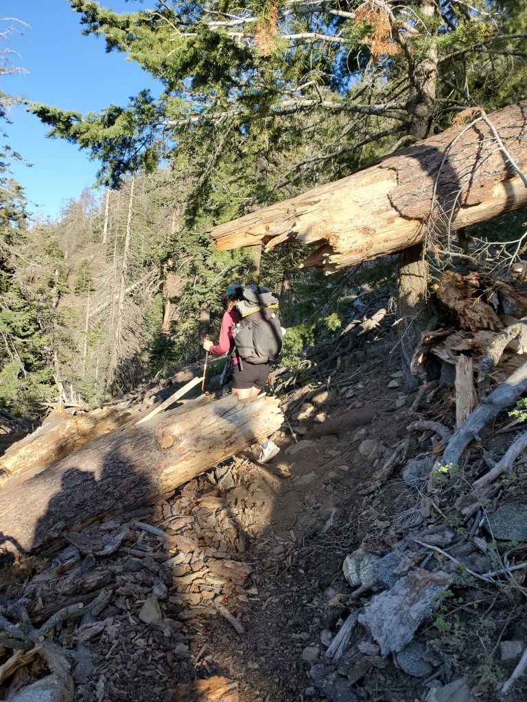 Podcast/music/audio book time for last climb of the day, 2,000 feet up. The low sun provided more shade amongst the intermittent trees, and the temperature cooled of as we got higher allowing us to move efficiently uphill. When we crested the ridge, we entered unhealthy fir forest. There was lots of blowdown, large old trees that gave in to their final gust not long ago.