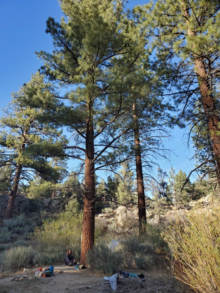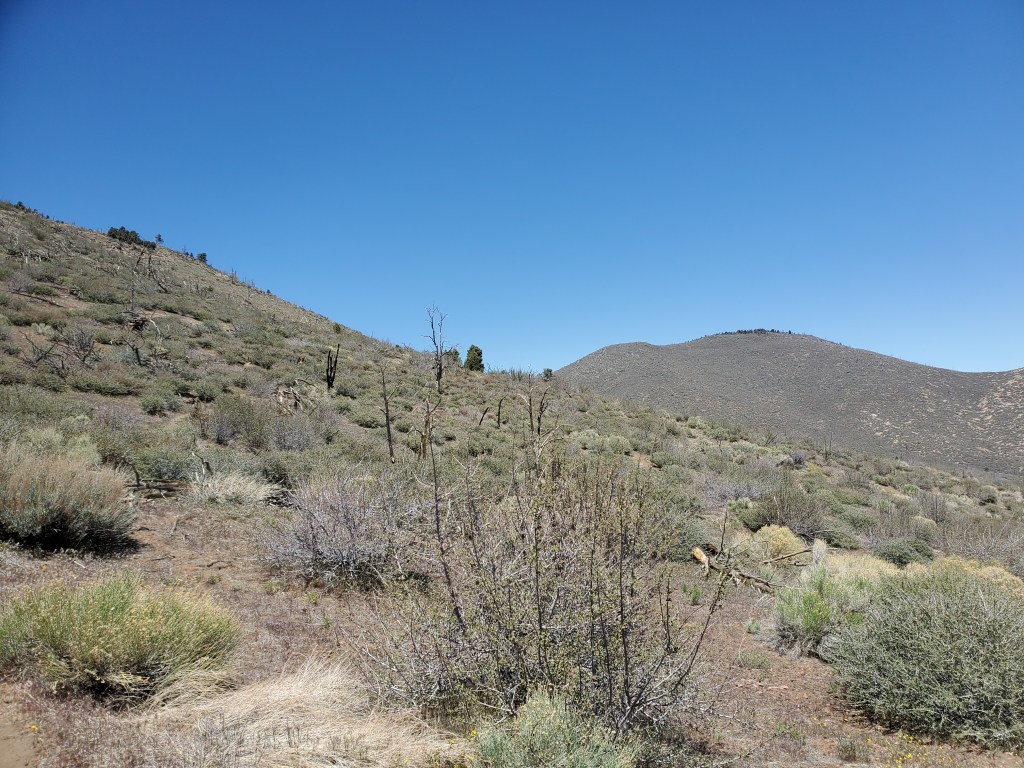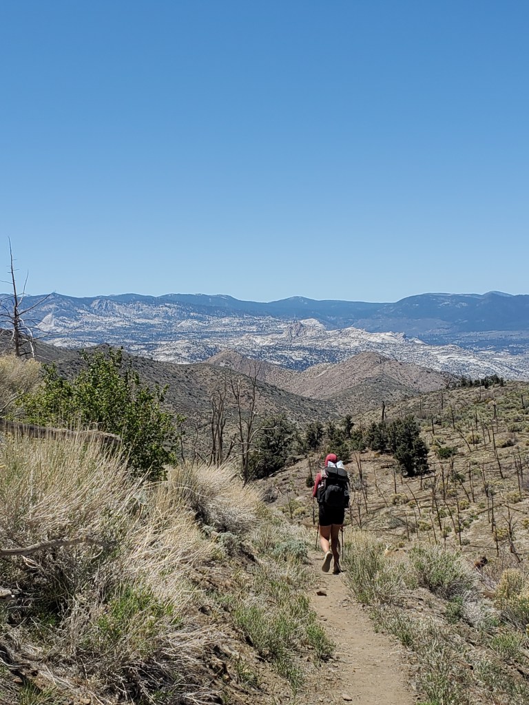 It’s an interesting time to be thru hiking, in the 21st century. We saw comments on our navigation app (Far Out) that an upcoming section had no shade. I checked the satellite view for forest and we decided to stop just 2 miles later for an early lunch under the shade of a big western juniper. A modern miracle, if you ask me. The trail continued the gentle climb up in an exposed old burn scar. The monotony called for us to put music/audio books in.