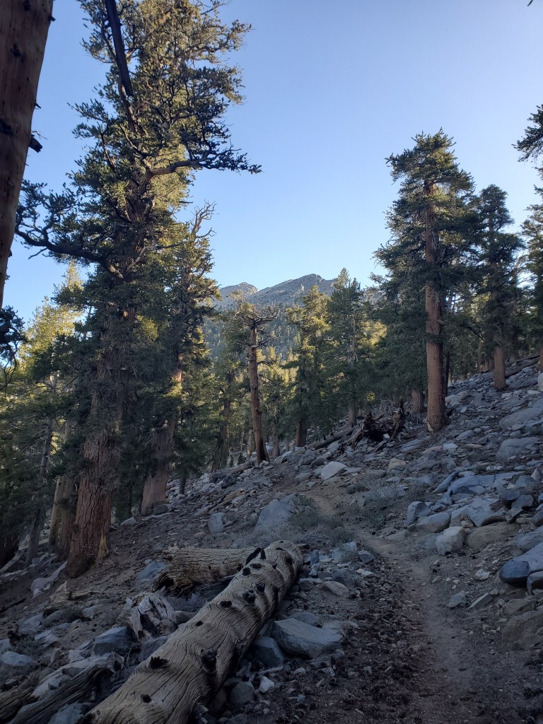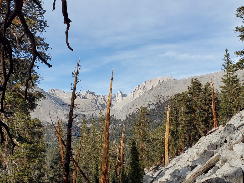 It was an unusually warm night and morning, can’t complain though. We got on trail at 7:20am, trying to stay on an early schedule. The trail took us over easy terrain on the side of Olancha Peak. Huge lodge pole pines, even bigger foxtail pines, and a few white bark pines surrounded us for much of the day.