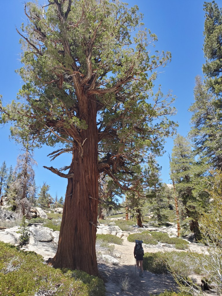 We took our morning snack break and realized that if we maintain ~20 mile days, we will get to our exit point, Kearsarge pass, a day early and we would have enough food. This was a relief in one sense, but it meant physically demanding days were ahead of us. We continued on a gentle downhill to Death Creek for water and lunch. The Austrians were moving slower, they arrived at the creek just before we were getting ready to move. We agreed to meet at a camp site about 12 miles ahead. Onward, we went up a long steady 1,600 foot climb. Big old western junipers dotted the sunny southern slope.
