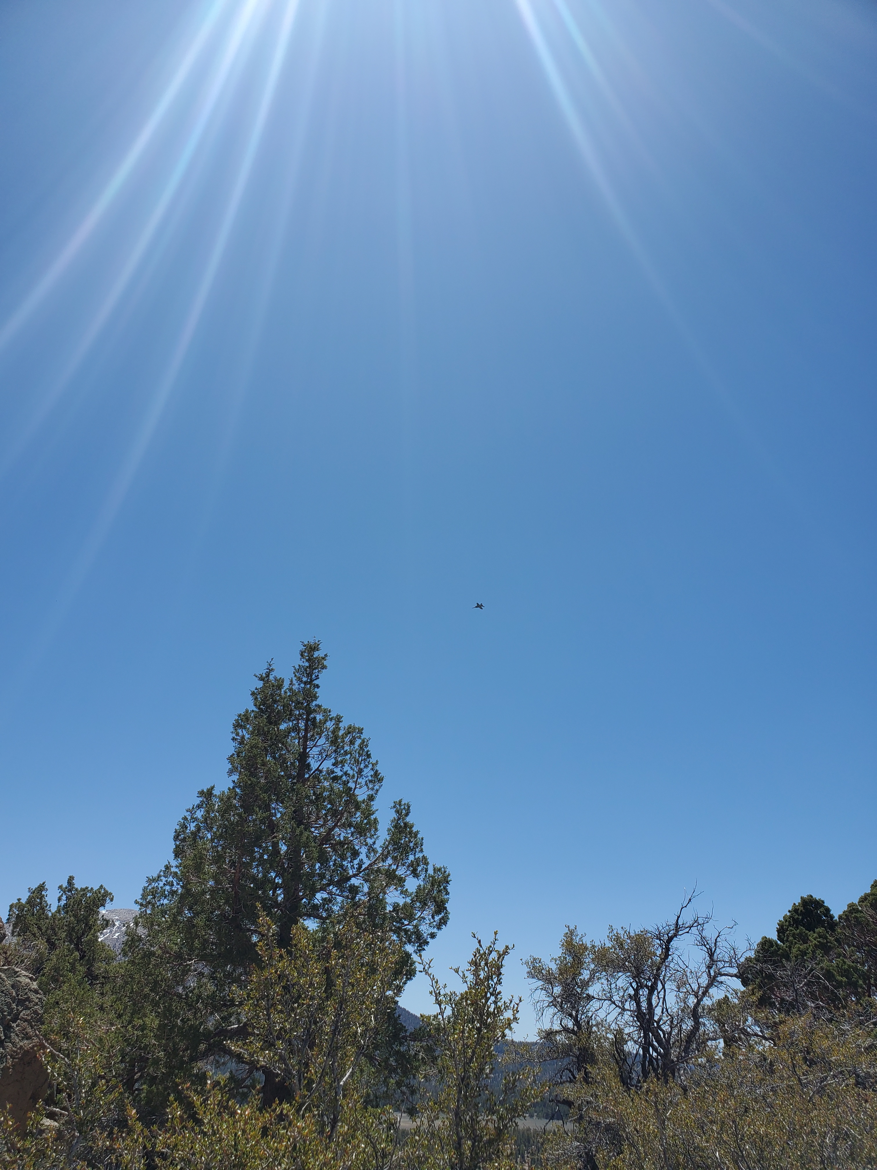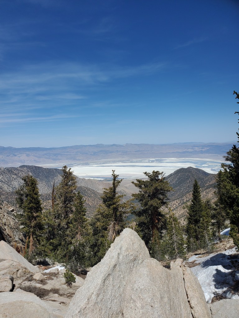 Lots of fighter jets flew in our wilderness airspace, some of them less than 100 feet overhead and doing banked turns and inverted flying. The deafening howl of the jets was somewhat cool for me, but it was very much out of place and a bit discomforting since we weren’t at some big sports event. At the top of the climb, we were rewarded with a view of Owen’s Valley and the former lake that Los Angeles has sucked dry with “the pipe.”