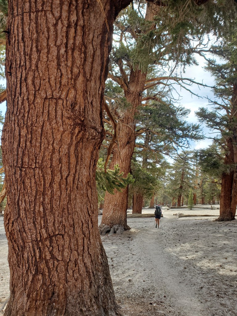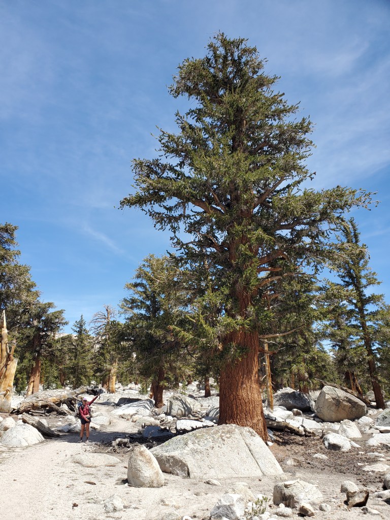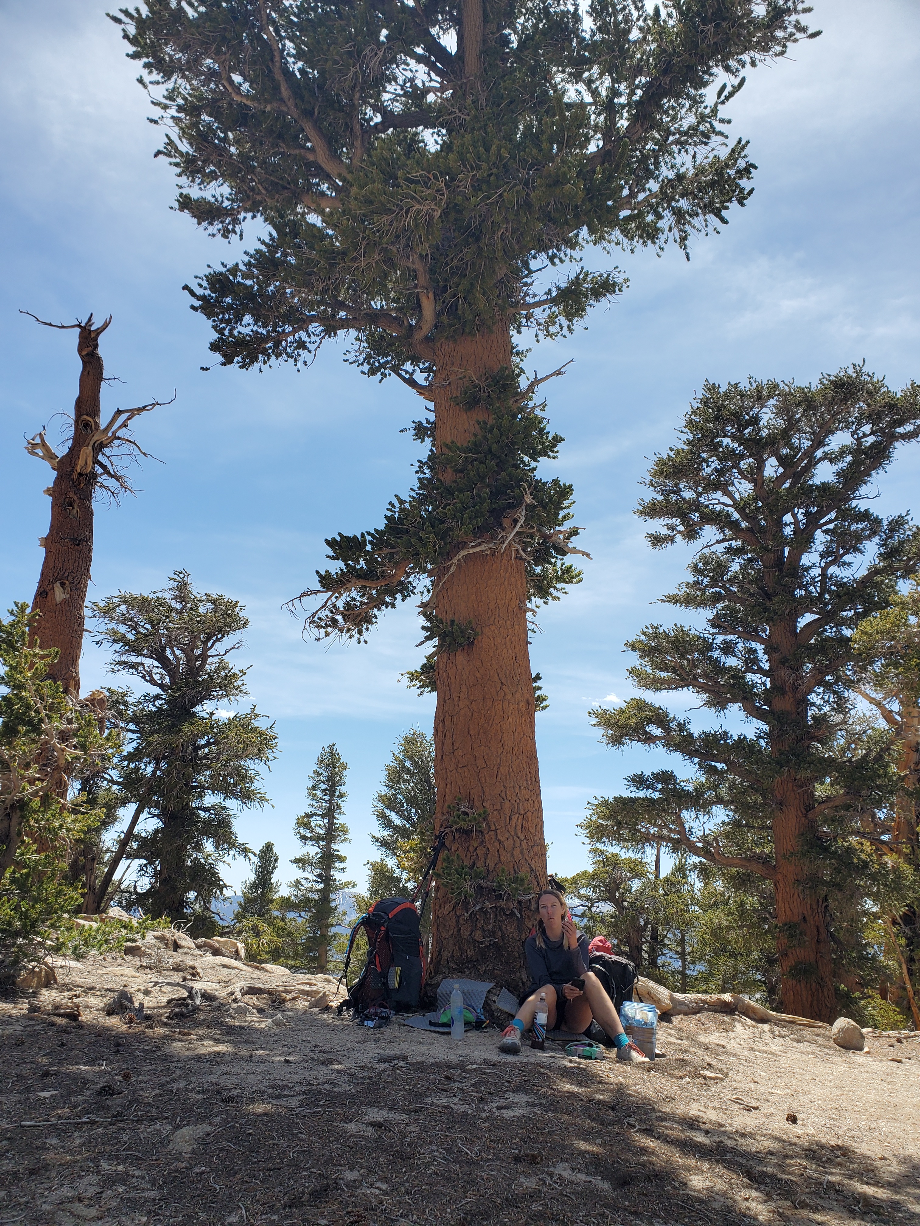 The trail continued down a long easy slope. Moving quickly now, we got to rock creek, the low point of our day. We got water and rested for a bit. We climbed up Guyot pass, which was steep but not as bad as we thought it would be. More giant foxtail pines, all spaced about 50 feet apart on bare granitic sand. Seems forest fires are rare here, allowing these foxtails to grow well into old age.