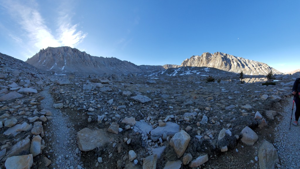 4:15 wake up again. We needed to get over Forester Pass while the snow was still frozen, which was 9 miles away. We were on trail at 6:15. The both of us got wet feet crossing icy streams within the first two miles. Being tired and worn out from the day before, wet cold feet put us in a sour mood to start. The trail took us over a few easy miles just below treeline, slowly climbing. We crossed Bighorn Plateau, which felt like the moon, barren and lifeless.