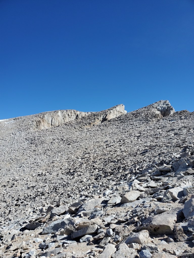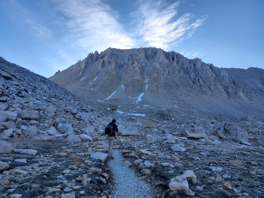We got past Guitar Lake around 7:30 when we saw the first hikers coming down from the sunrise summit. They all sounded joyful to have experienced sunrise above 14,000 feet, but they looked haggard and frozen from their dark windy hike. The trail continued up gentle switchbacks. We made it to top of the ridge at 13,450 feet, 2 miles south and 1,055 feet shy of the summit. The trail was well built and maintained, even at this altitude. There were very few sections of talus, a bit of a surprise compared to our experience on Colorado 14ers.