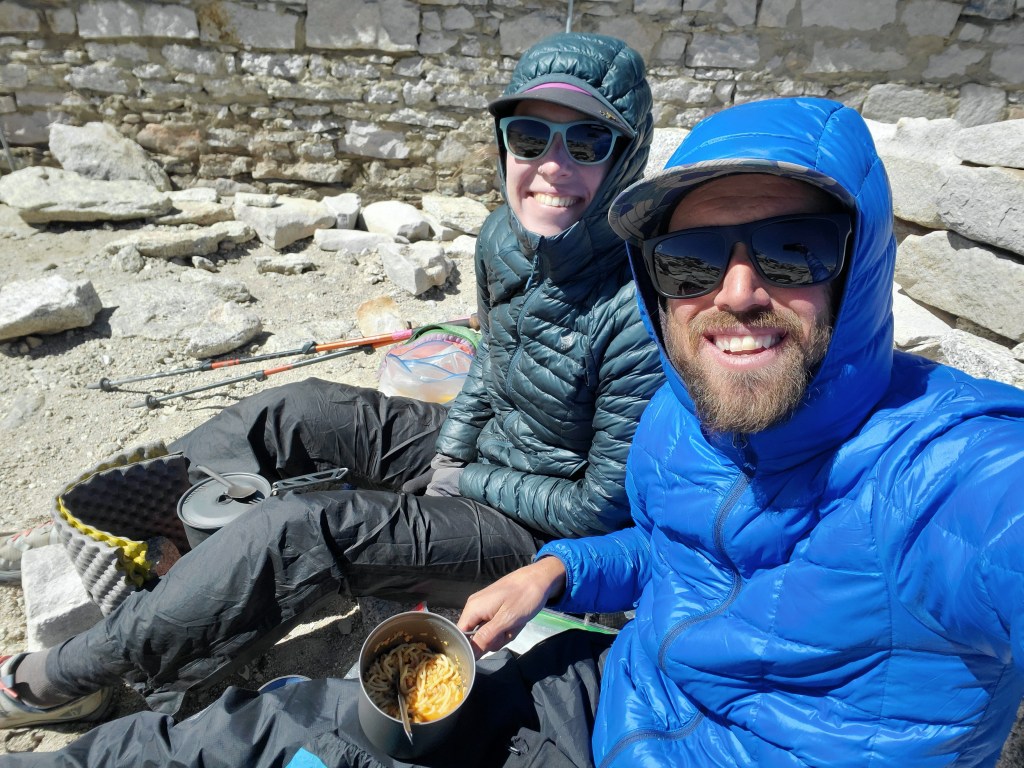 We got some quick pics at the summit then went to shelter behind a modest rock wall, protecting us from the worst of the wind’s icy bite. We made hot lunch, Thai noodles for me and ramen for Maggie. We took pics for others as they reached the summit, hanging out up top for just over an hour.