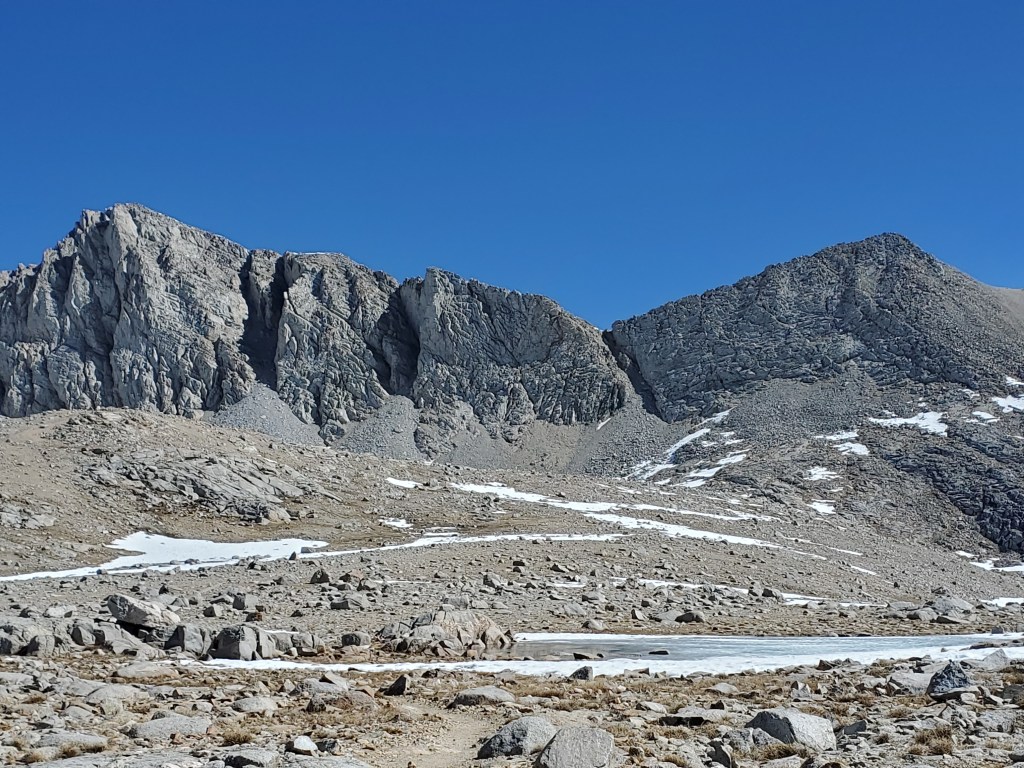 We only had 6 miles to get over Kearsarge Pass and out to the trail head where we could get a ride to Lone Pine. We made a hot breakfast, oatmeal for Maggie and mashed potatoes for me. We got on trail at 8:30. A steady climb up to the top of the pass at 11,700′. We were rewarded with epic views of the High Sierra, looking upon the dominion of University Peak, a local 13er.