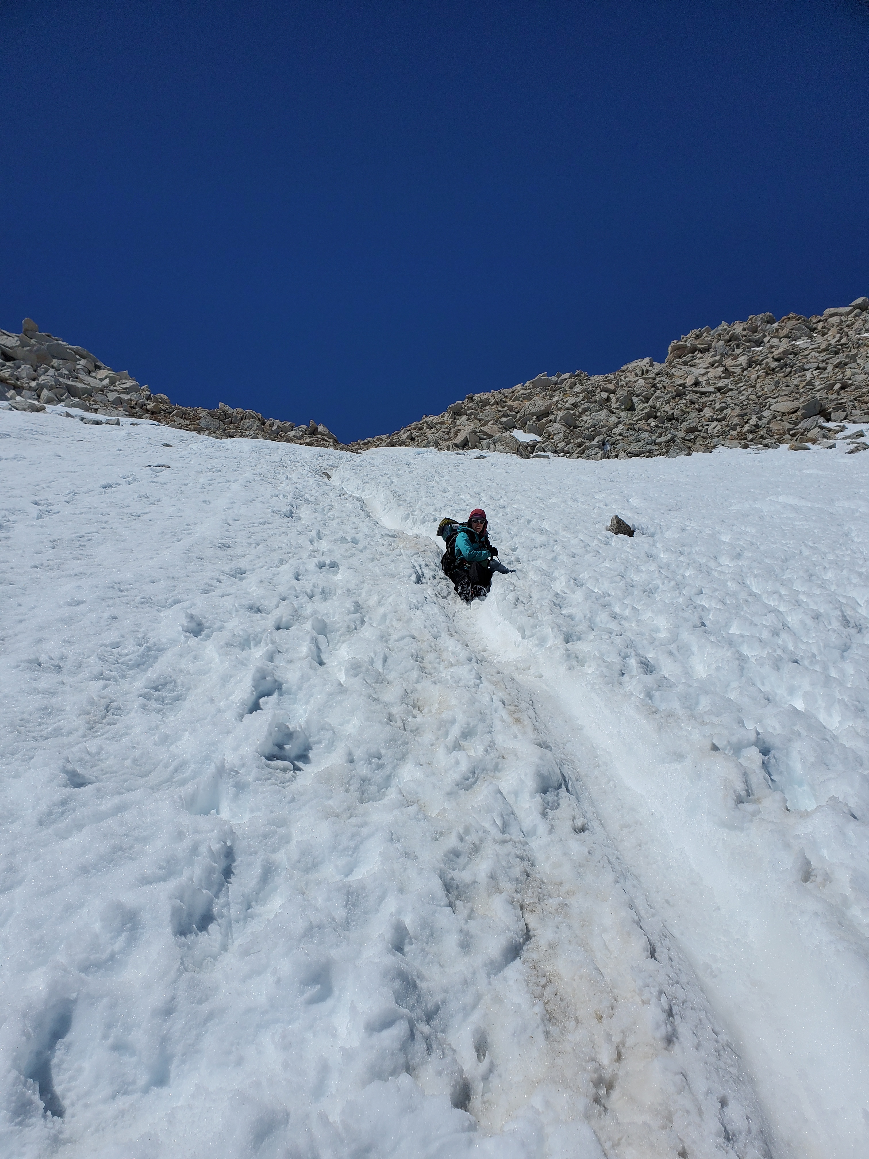We slid down most of the way, with a couple postholes when walking. Our feet were wet again, but we had accepted it by now. We swapped the axes back for trekking poles and continued across the low angle snow.