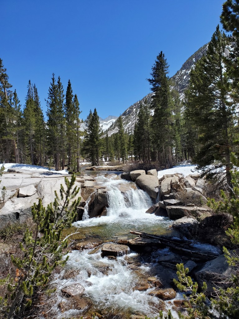 The trail weaved down the ridge to a grassy spot by the creek. We ate lunch with four other hikers, chatting about adventures in our previous lives. Down the valley, there was lots of snow to traverse. In the peak of the spring melt, there was no shortage of running water on the trail. I mean the trail was literally a creek for some stretches. This was supposed to be easy downhill miles, but the snow and water slowed our pace considerably. We finally got into the forest again where trail conditions improved, but it was still wet and snowy. We had no reason to complain though; gorgeous peaks, and a wonderful creek with waterfalls brightened our day.