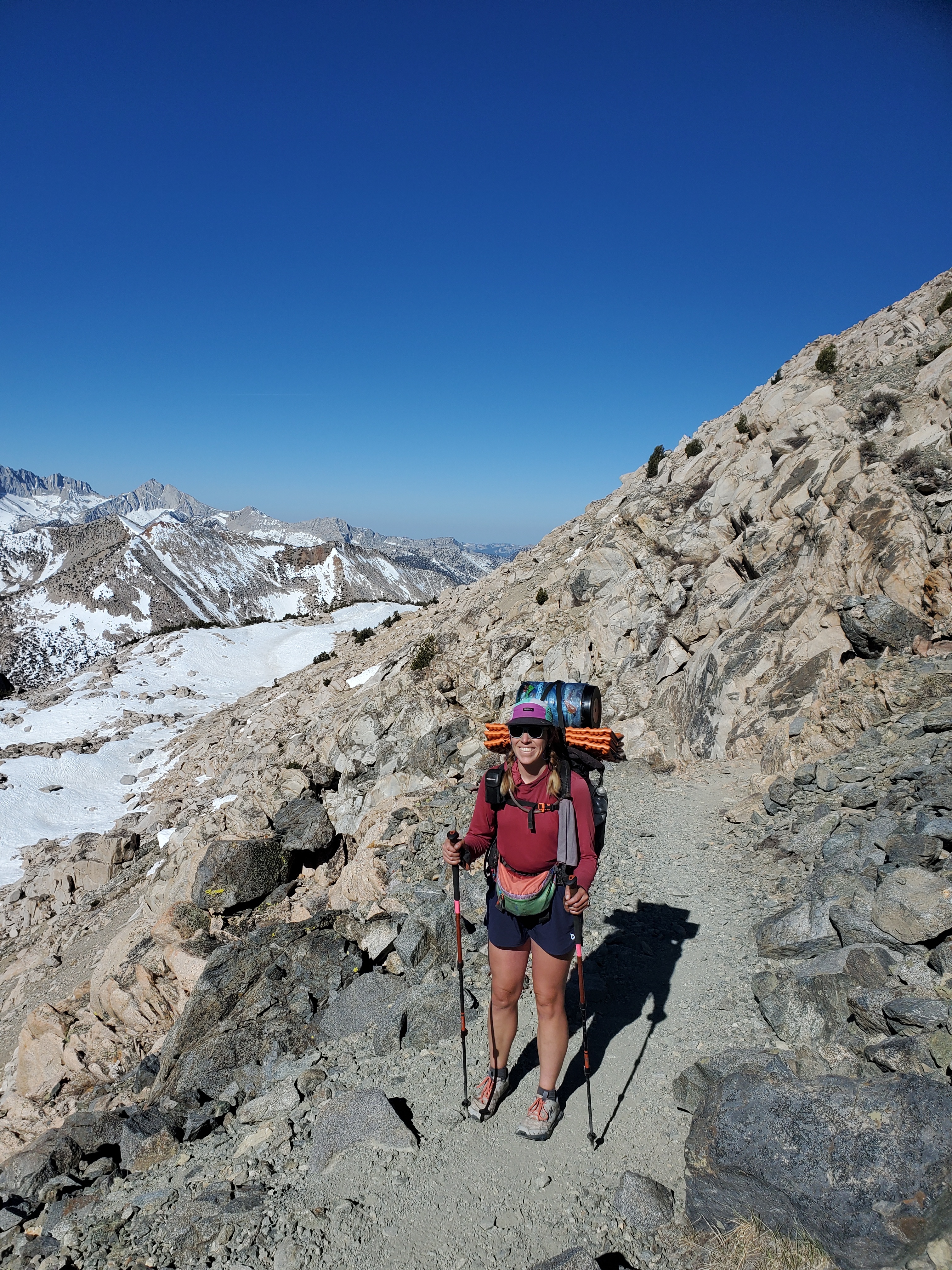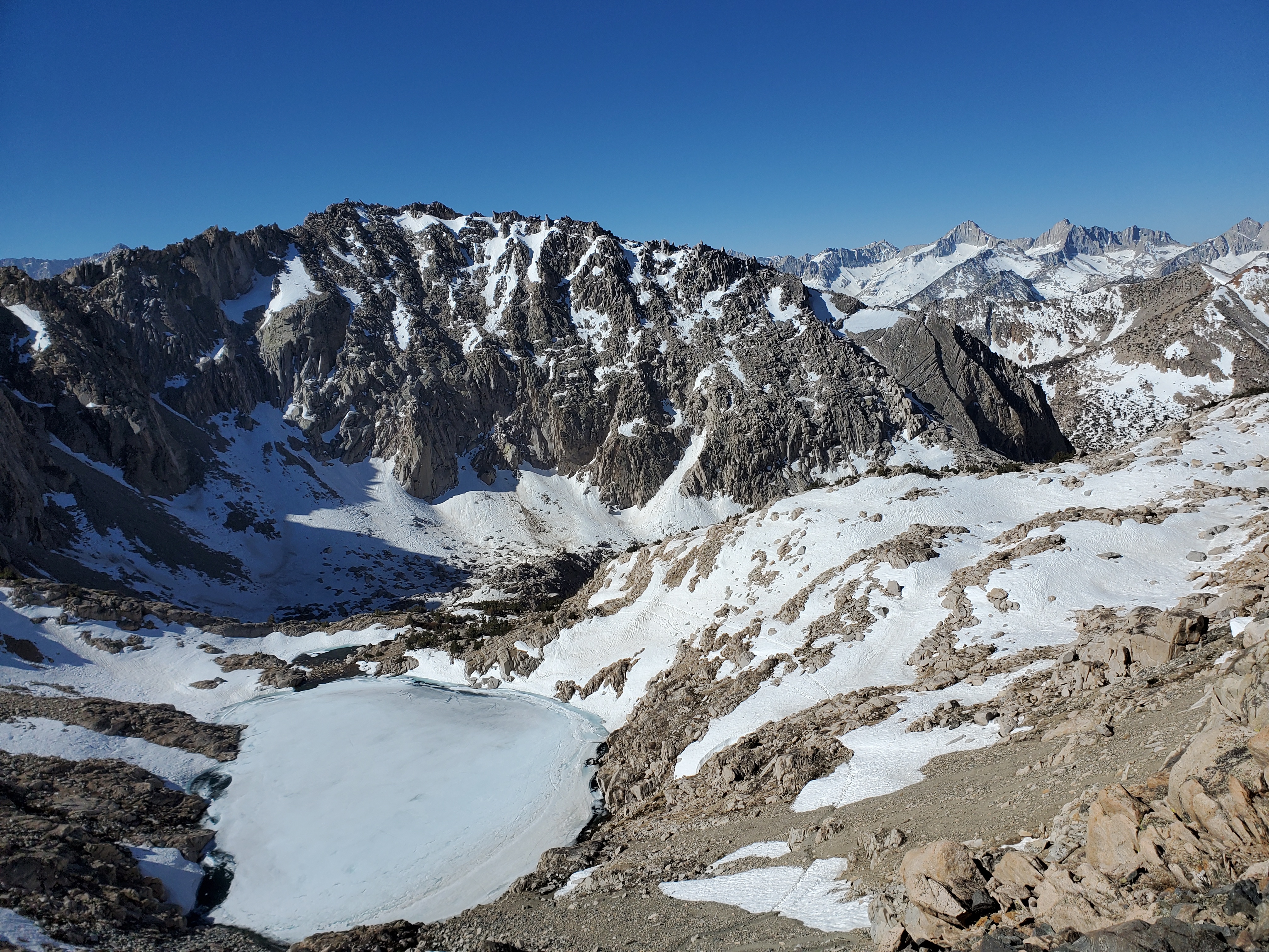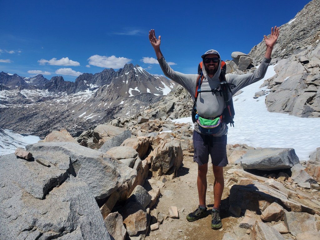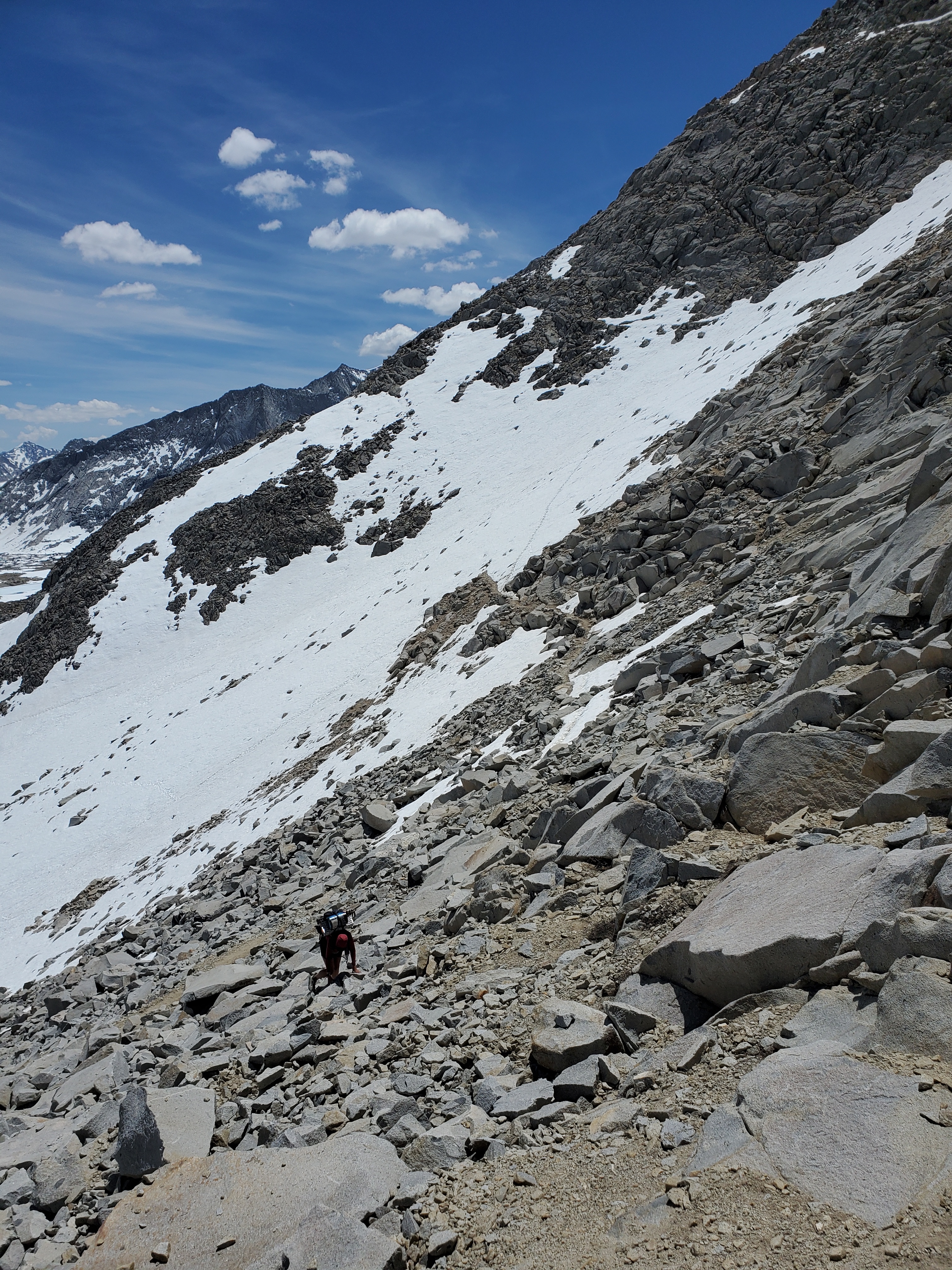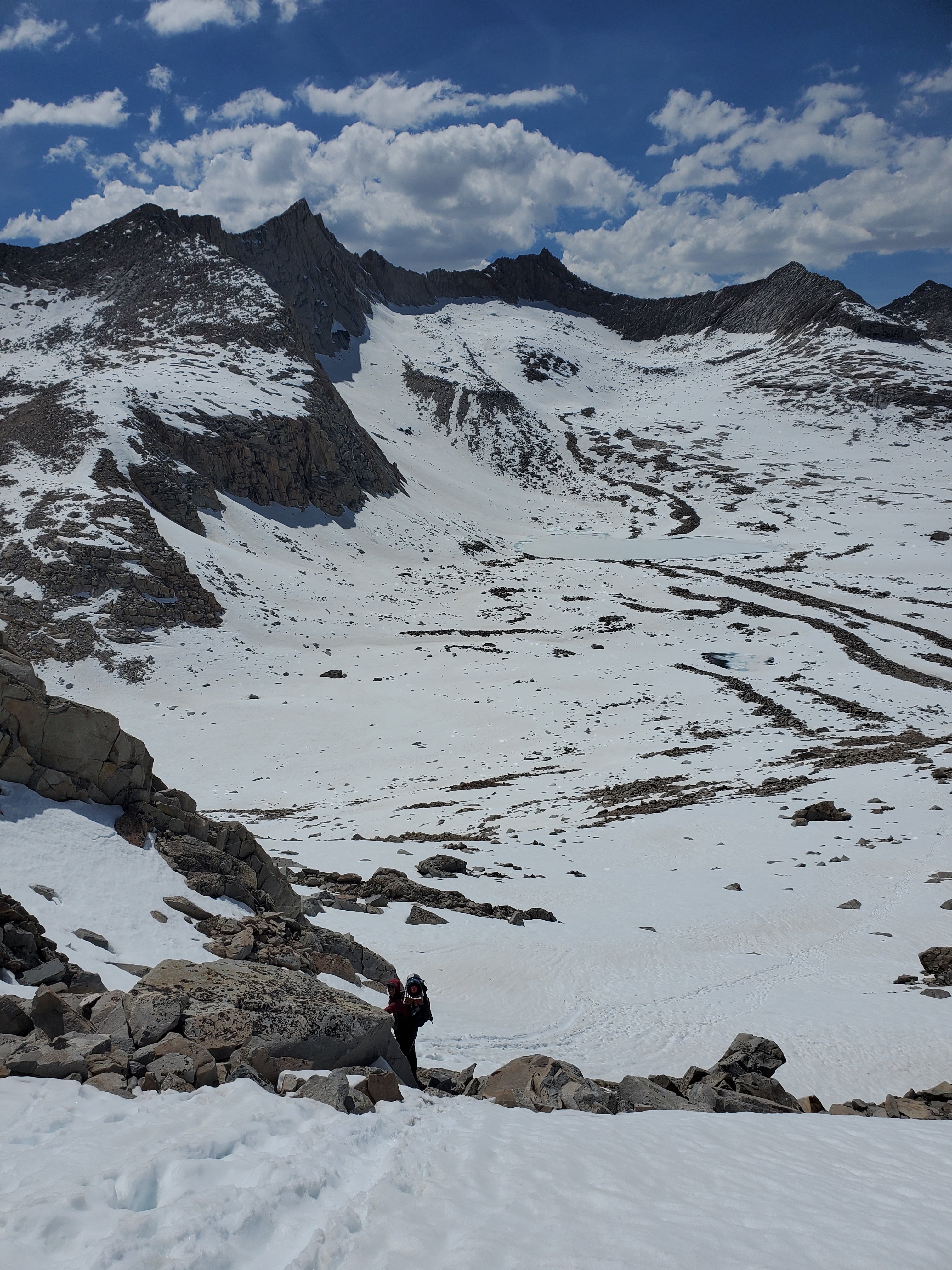 The scramble was solid Class 3, which we are both comfortable with, but the 25+ pound packs definitely added to the challenge. Even though I felt completely in control, my heart was racing, wondering if I would be rememered as that guy who tried to get over Mather Pass by scrambling off trail. One step at a time, testing the talus, and stepping up ledges, we made it to the top where we were greeted by what was perhaps the most epic view yet – the Palisades. Words cannot describe the natural beauty of the mountains and the valley ahead of us, but what was obvious was that we had a lot of snow to traverse.