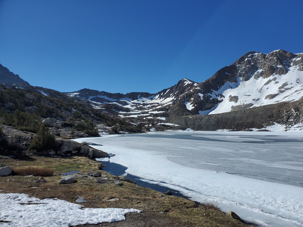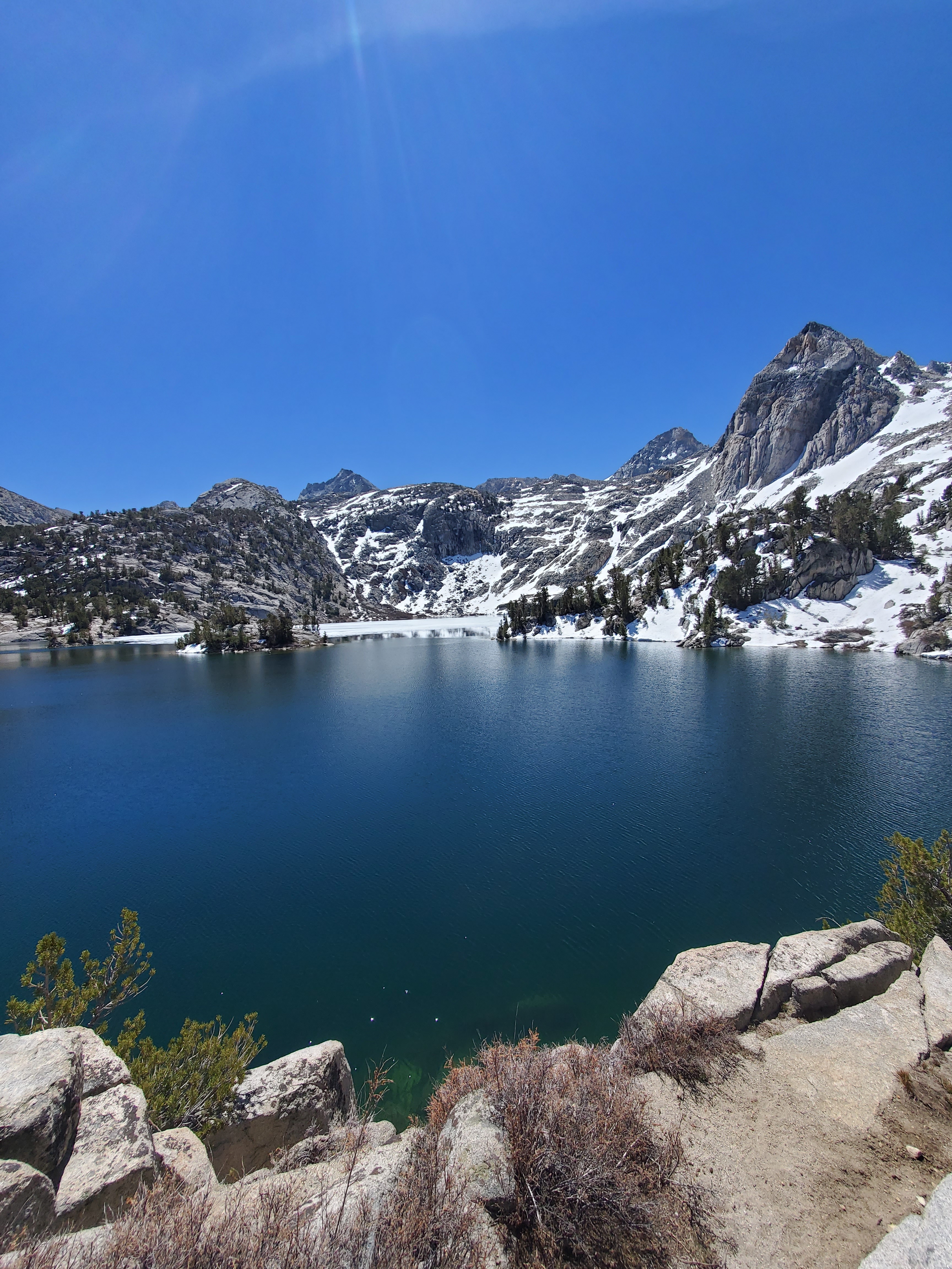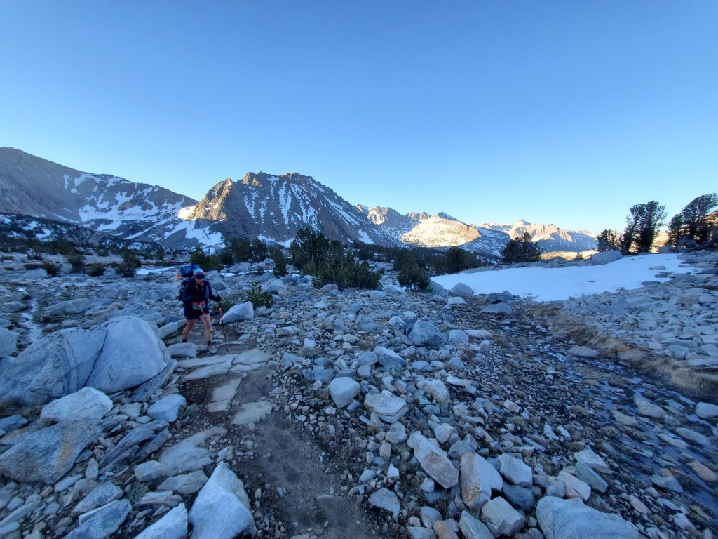 We donned our microspikes and got the ice axes in hand for the steep, snowy north side. A solid bootpack was set so we just had to follow in the footsteps of those who came before us. We didn’t need the axes for long and switched to trekking poles once the slope angle became less hazardous. We worked our way down to Rae Lakes, a pair of large alpine lakes with so many golden trout, you could probably grab one from the shoreline without too much effort. We took a lake break, taking in the view and a handful of snacks.