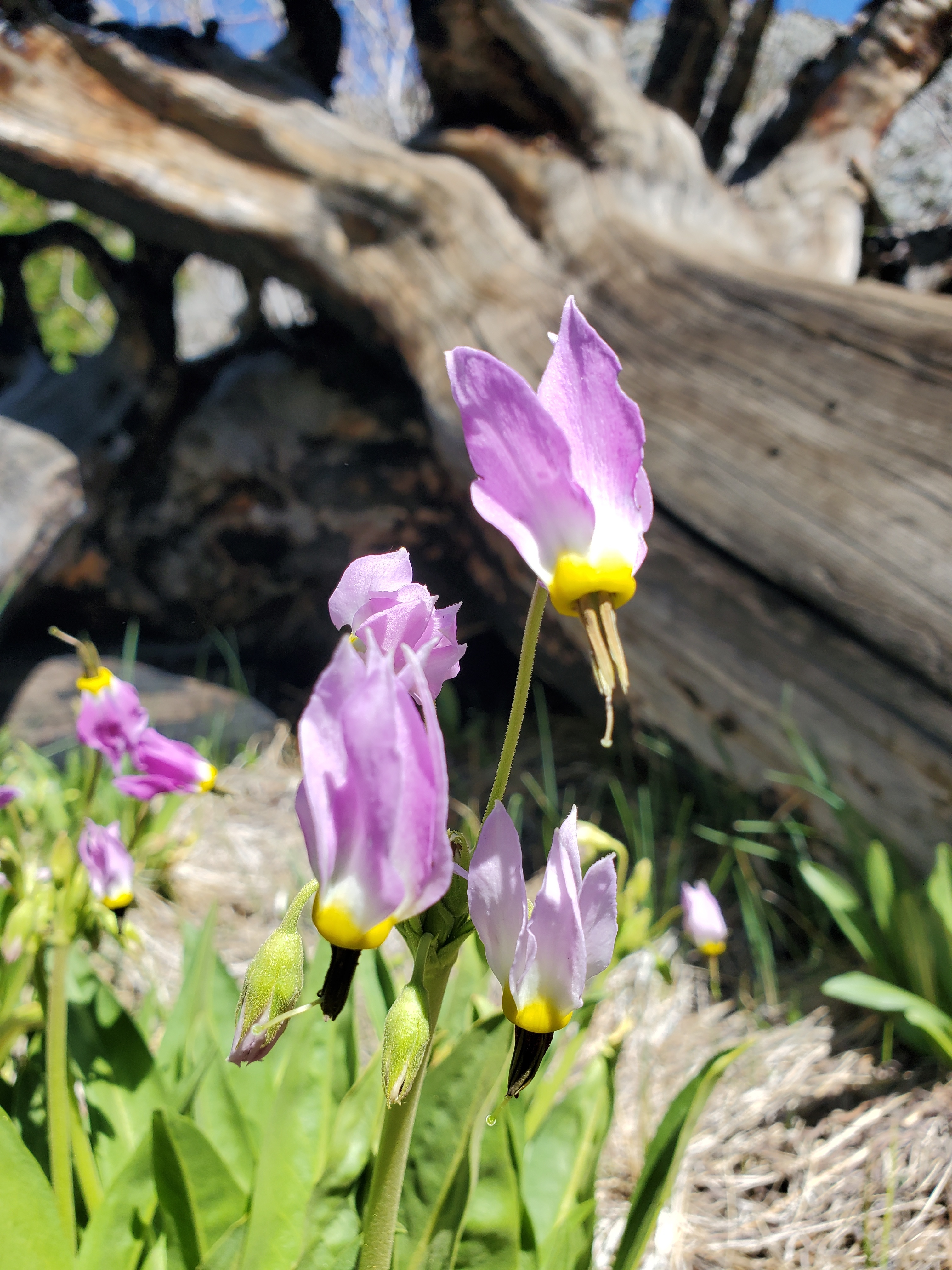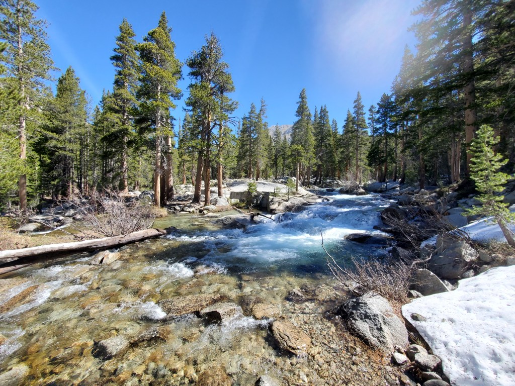 Not long after we started, Maggie got tripped up on some rocks and fell down, scraping her knee and earning a badass battle scar between her eyebrows. Thankfully, the damage was mostly superficial, and after a few minutes, we were moving again. We eased up on the pace, taking our time as we dropped below treeline. We took a long lunch at Palisades-Kings River confluence, shaded by large pines and firs. I took a quick dip in the Kings River to cool off, then sat in Pallisades Creek for a moment as well. The creek was colder. Down in the valleys, we saw the first signs that spring was coming to the mountains, shooting stars and small yellow lillies popping up where they could.