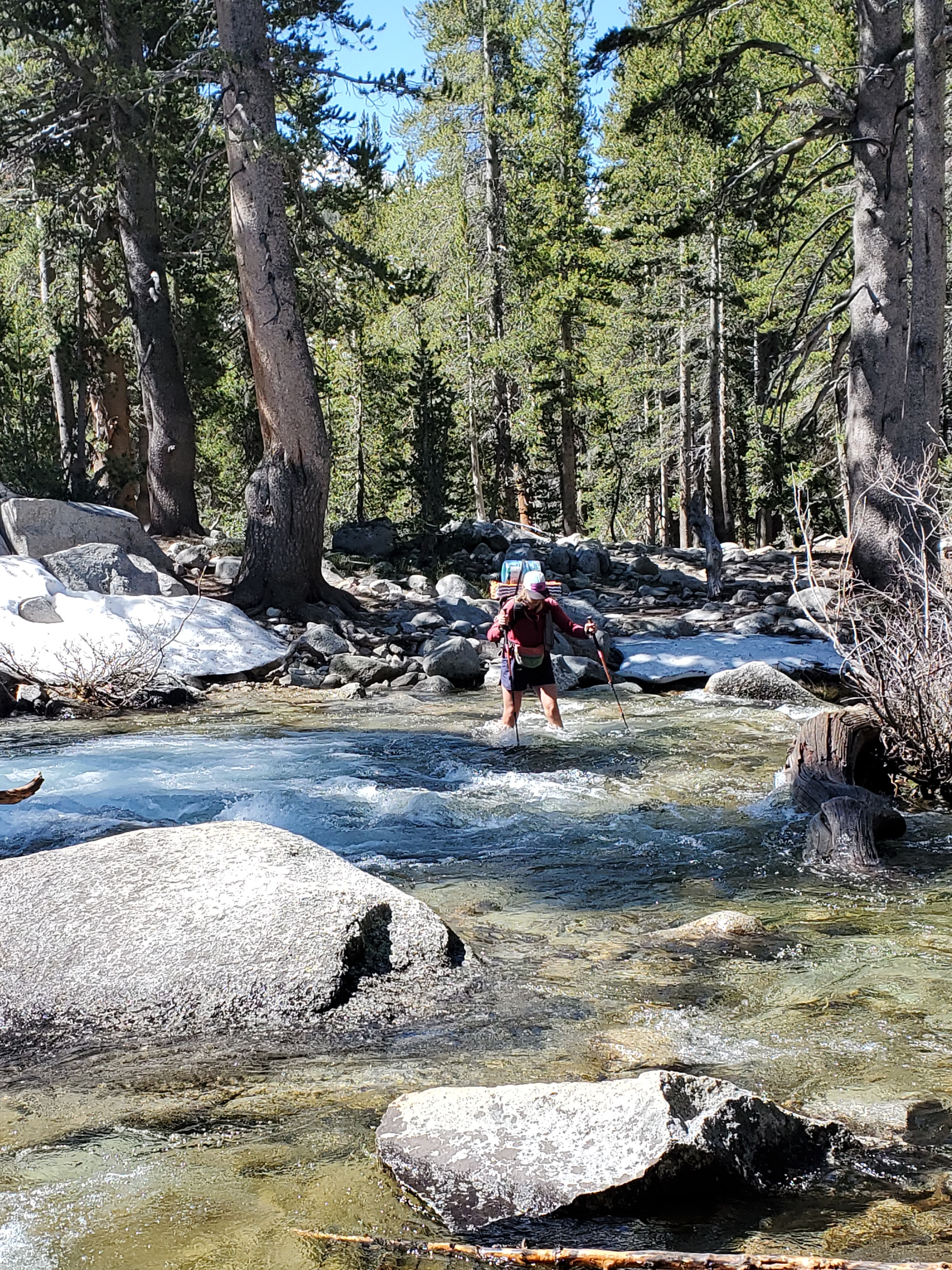 Onward down the valley again, there was about 9 miles between Pinchot and Mather Pass. We would’ve had to run to make it there while the snow was reasonably firm, but alas, we couldn’t run. We hiked down as fast as possible where we bottomed out on the South Fork of the Kings River. We had been warned about hairy river crossings in the Sierras, and this was our first test. The current was manageable, though the water did get above my knees at one point. We both got across with out issue.