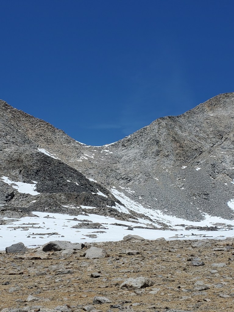 We proceeded up the gentle climb towards Mather Pass, romping through every bit of flowing water we crossed, since it wasn’t worth our time to try avoiding wet shoes anymore. We stopped for lunch at 11am and dried out our pruney feet for a bit. Four more miles to Mather Pass over mud, rock, and some very soft, slushy snow. The state of the snow did not inspire confidence for the snow climb and descent that lie ahead of us. I’m sure anyone reading this with any mountaineering experience is shaking their head in horror.