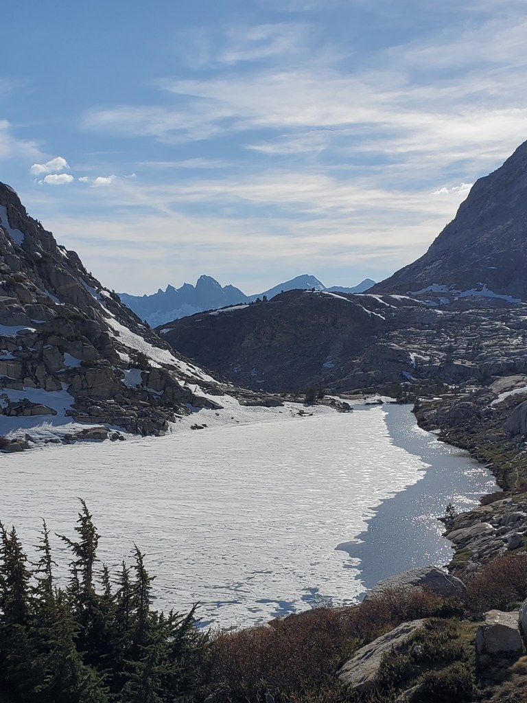 We put on microspikes for about a mile where the trail was on a side slope. The snow was firm and icy, so the spikes helped us move quickly through this stretch of snow. The dirt path became apparent again so we took the spikes off for the final climb. As advertised, Pinchot Pass wasn’t bad, and we were on top before 8am. The north side was relatively snow free and an easy slope, so we didn’t bother with the spikey gear. However, I did slip on some ice, initiating one of those weird slow motion falls, and nearly busted my face open on a rock. I caught myself at the last second, my wrist taking the brunt of the fall, but the pain didn’t linger for long. We took a morning snack break near the stream carrying water from the icy alpine lakes above. Much of the granite around us was polished to a nearly mirror finish, some parallel scratches all pointing downhill. This polish, in addition to the distinctive U-shaped valleys, is all that remains of a time when this land was buried by millions of tons of ice. Interesting to think about ice polishing granite.
