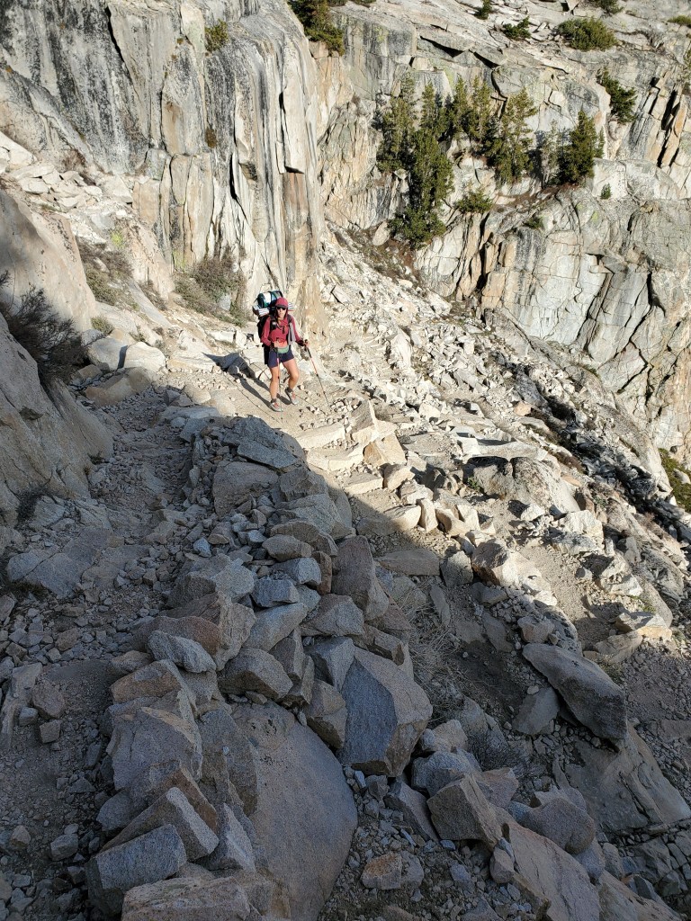 The first spot was too damp. Another half mile down tight switchbacks on a cliff and we found a site that was workable, and it had a spectacular view. Maggie grabbed water from Pallisade Creek (although ‘raging waterfall’ is probably more accurate than ‘creek’), and I pitched the tent. We were done at 6:30pm, over 12 hours after we set off, meaning we barely averaged 1.5 miles per hour. The Sierras are not to be taken lightly. Thankfully, we could take it easy the next day.