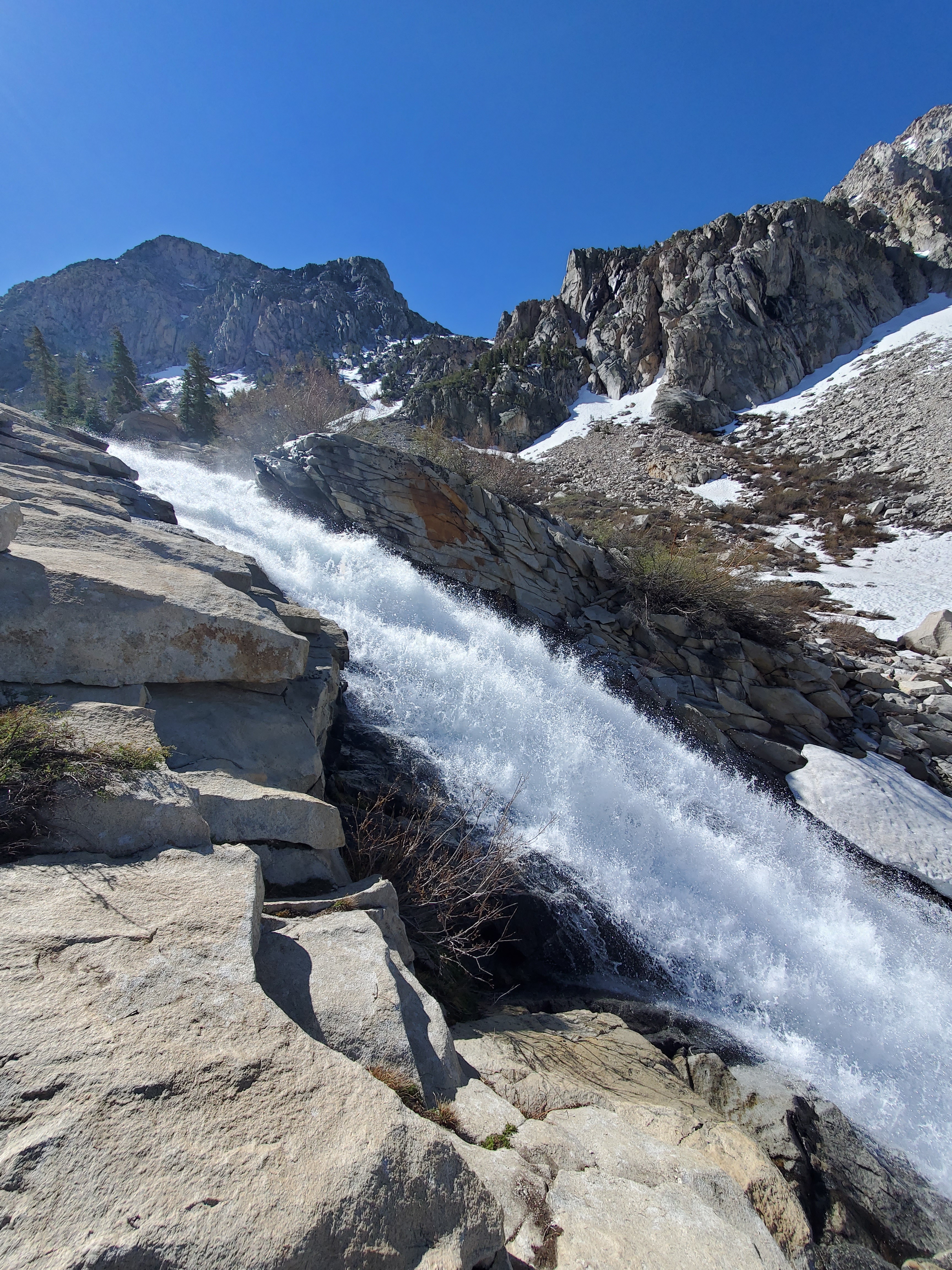 We descended towards Pallisade lake, where the steep cliffs and steady snowmelt produced countless waterfalls. It was absolutley gorgeous. North Pallisade Peak loomed overhead with its impenetrable fins and cliffs warning us to stay on the trail. Despite the mileage so far being well within our ability, we were fading fast, beat down by the vert and the snow. We eagerly looked for the first place we could pitch our tent.