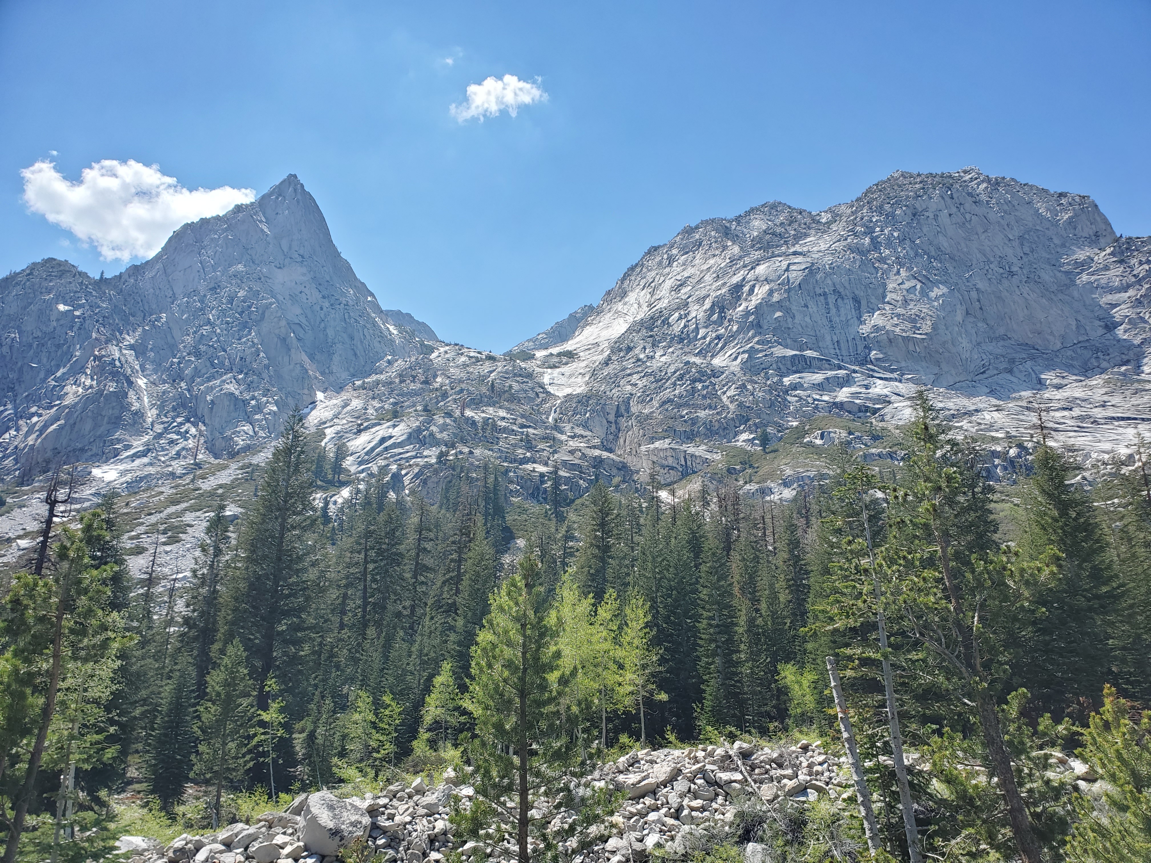 We continued up the Middle Fork of the Kings River valley. Towering granite domes and peaks rose 2,000 feet overhead. With time to kill, we couldn’t help but take a boulder break to take in the view, shirts off to soak up the sun. We admired the stark geological difference between the Sierra Nevada and the Rocky Mountains. Having grown up playing in the Rockies, I just thought mountains were.. rocky? That is to say the jumbled piles of talus that define the Rockies. The Sierras stand out with their solid granite blocks, sentinels standing watch after millenia of galciation.