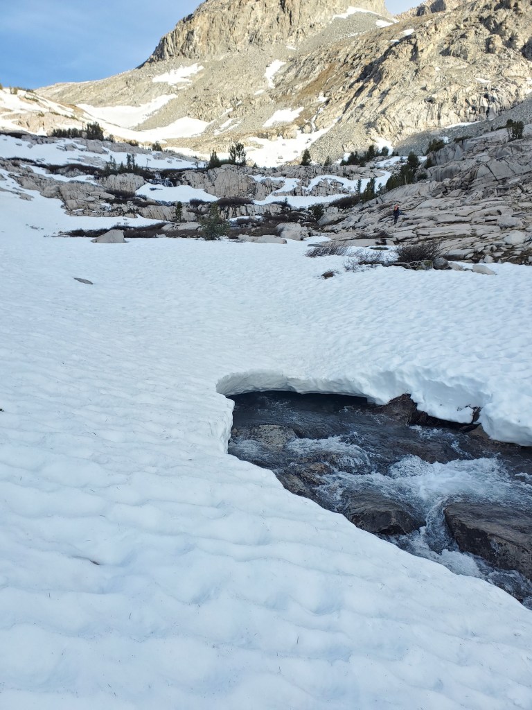 Two hours and four miles later, the snow relented and we took a lengthy lunch break near Evolution Lake to decompress. Onward, we had a long, easy descent down Evolution valley. The trail was snow free. Evolution Creek provided plenty of cascades and waterfalls to ogle as we hiked.