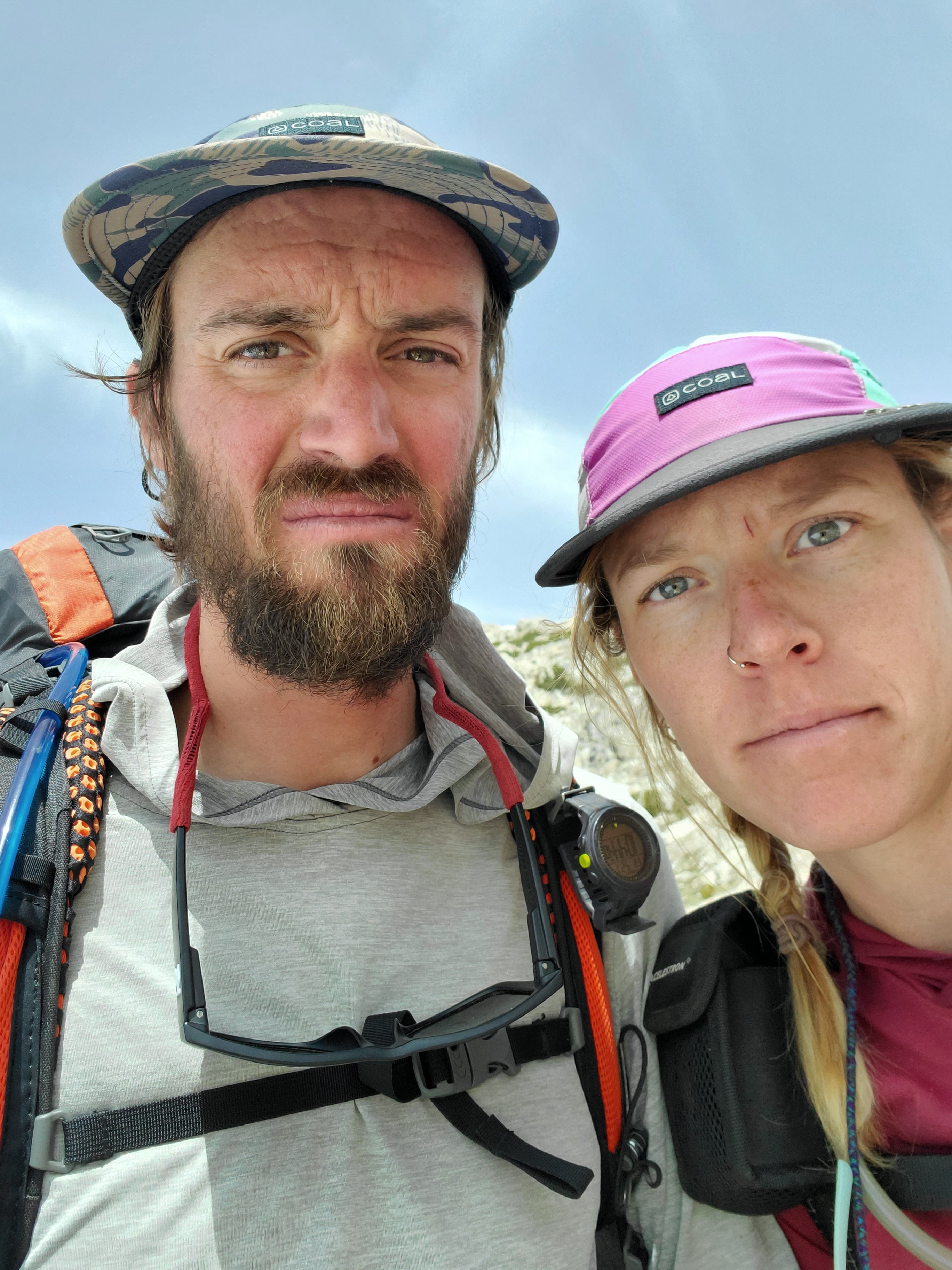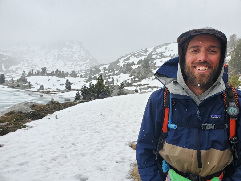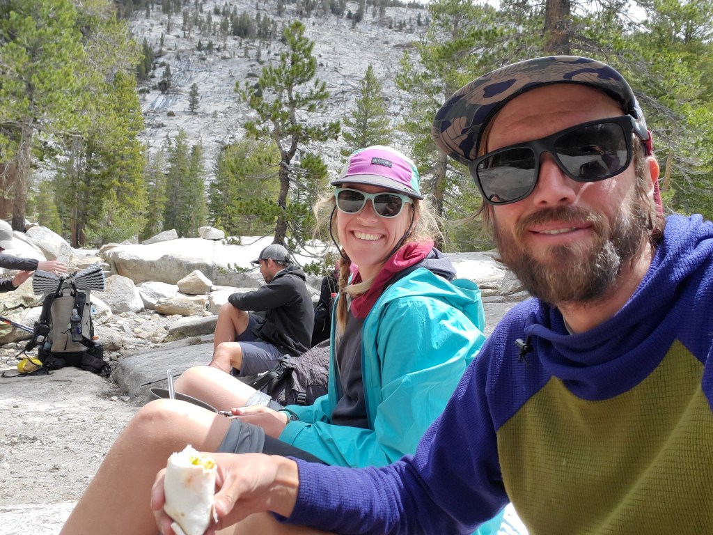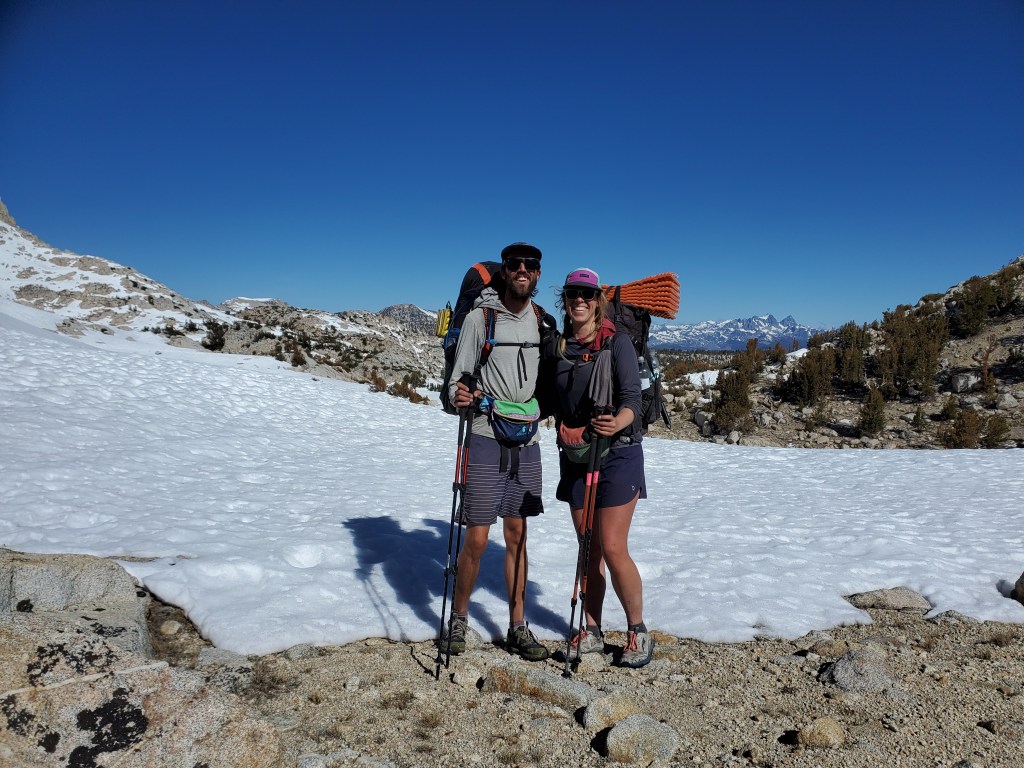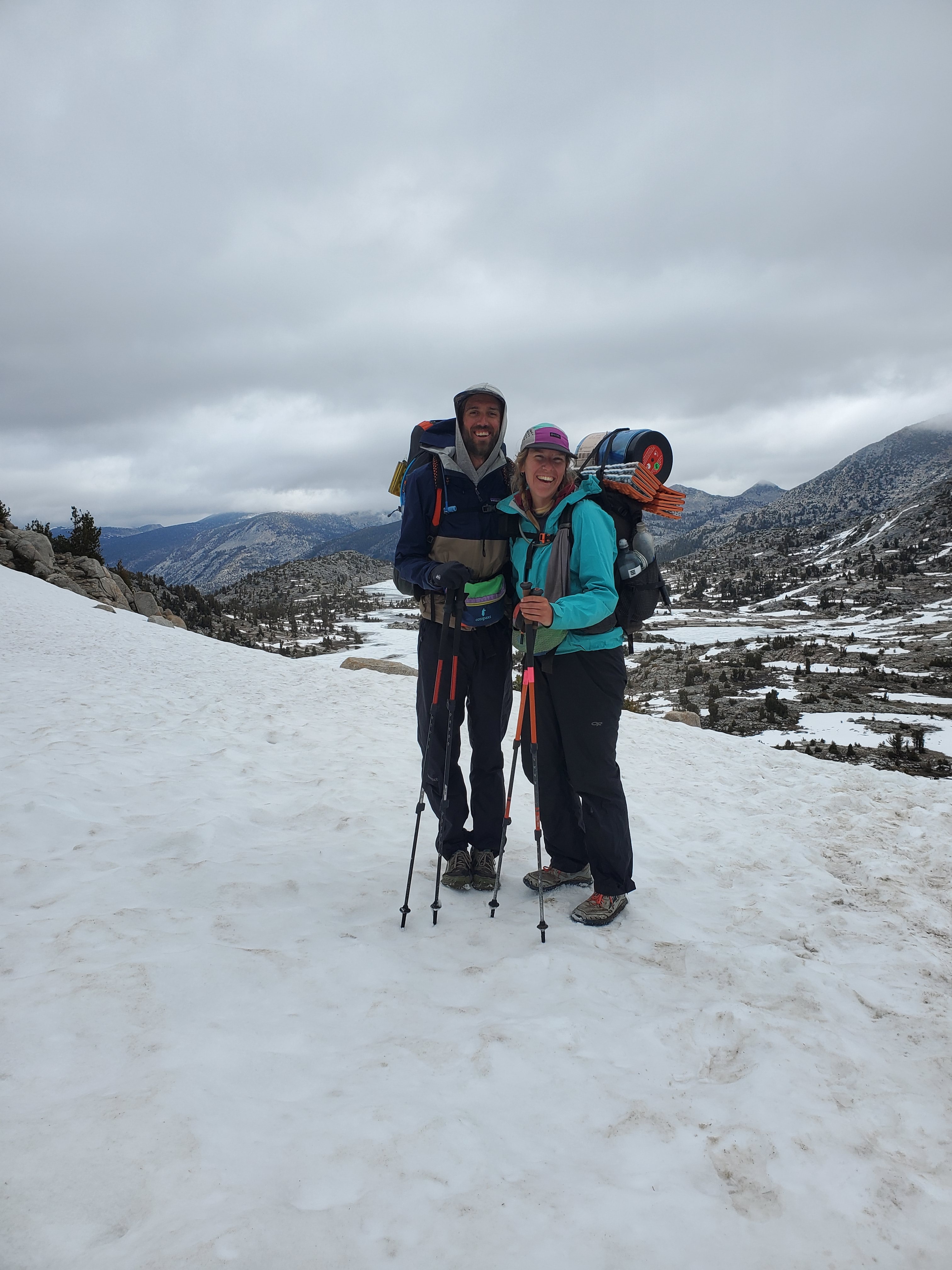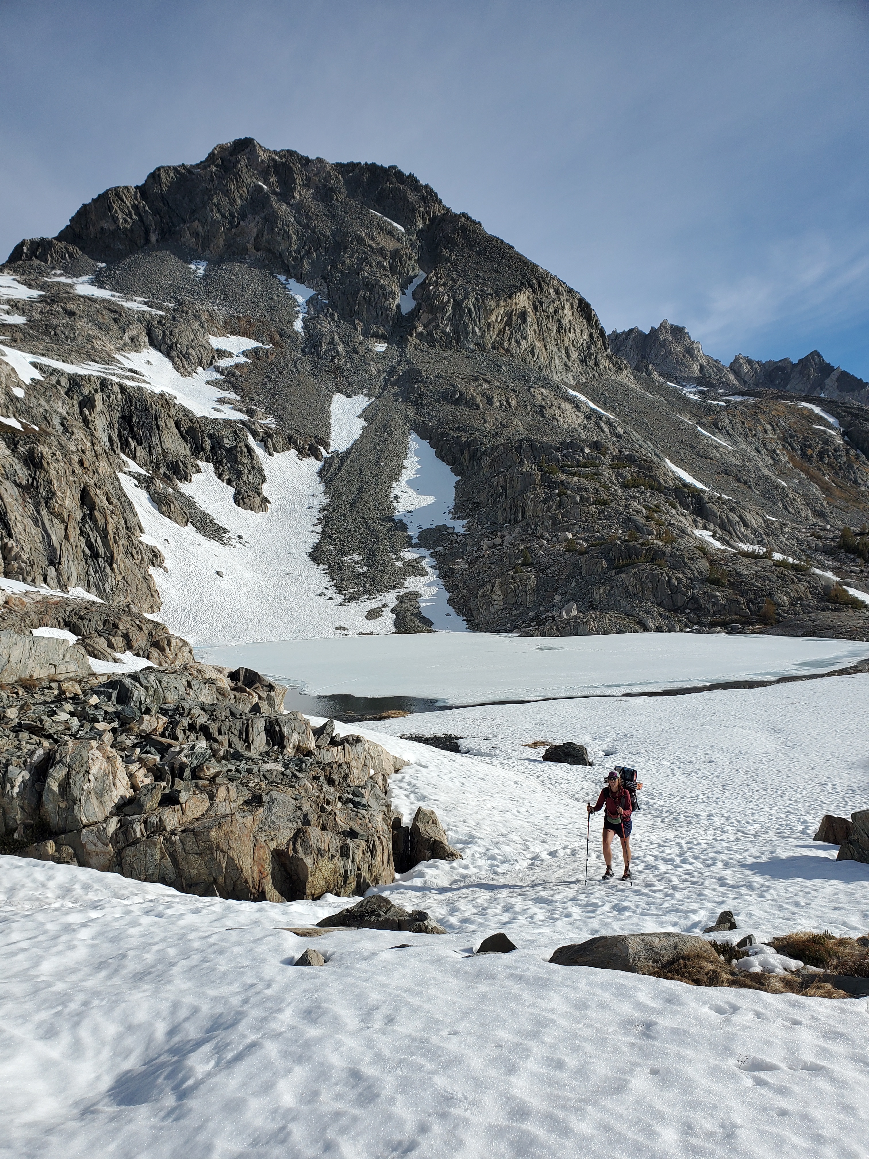 While Maggie was crossing, she slipped and bumped her knee, but she kept her shoes dry. The injury was minor and we kept moving to stay warm. When we got above treeline, it was easy going with firm snow from the solid freeze the night before. We got to the top and naturally stopped for a snack break. We met two JMT hikers, recent grads of the DPT program at Regis University in Denver. We made sure to ask them for physical therapy advice before they set off south bound.