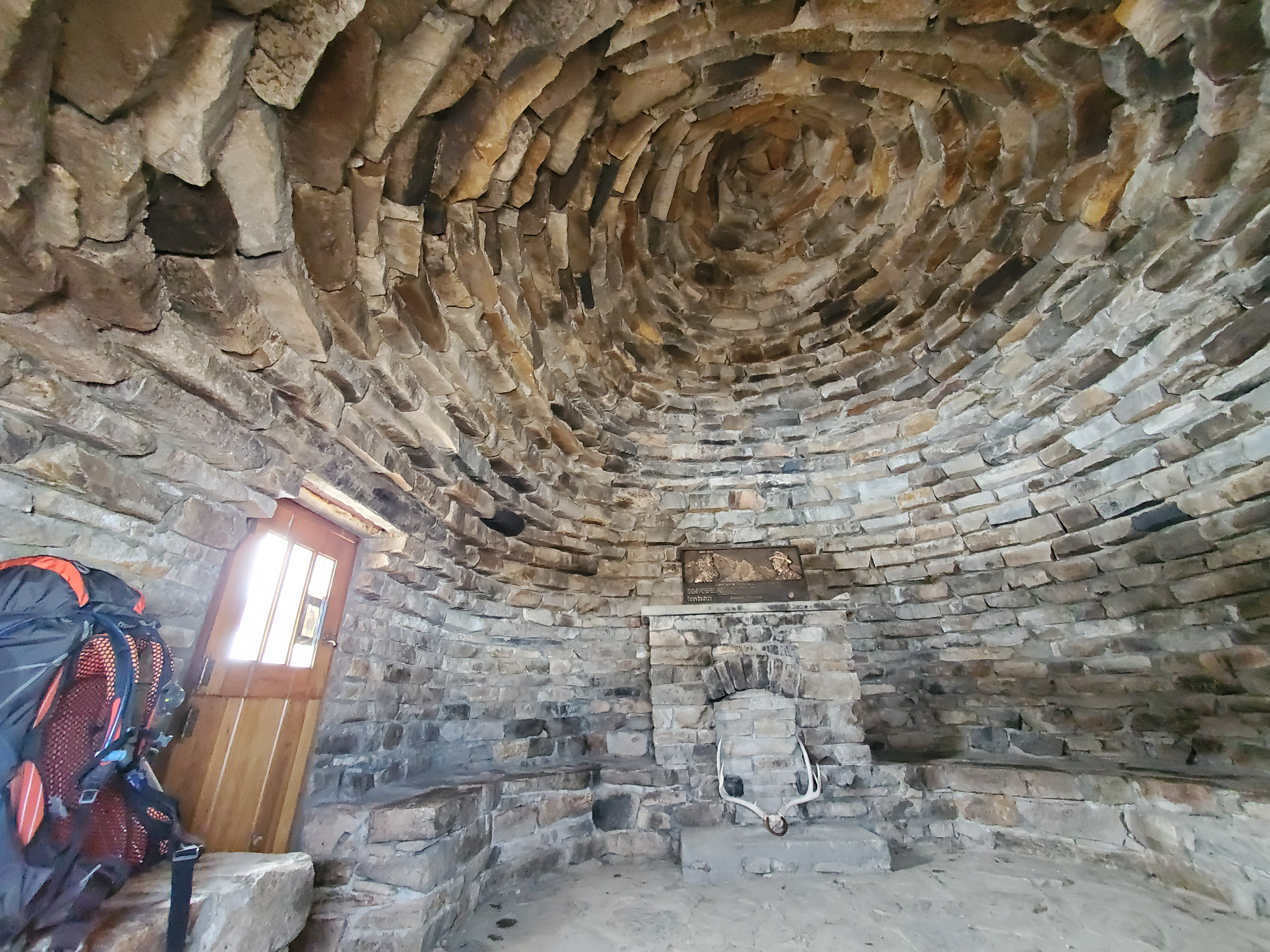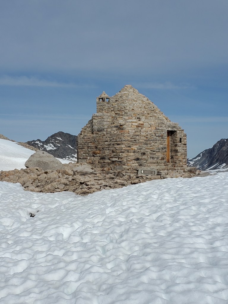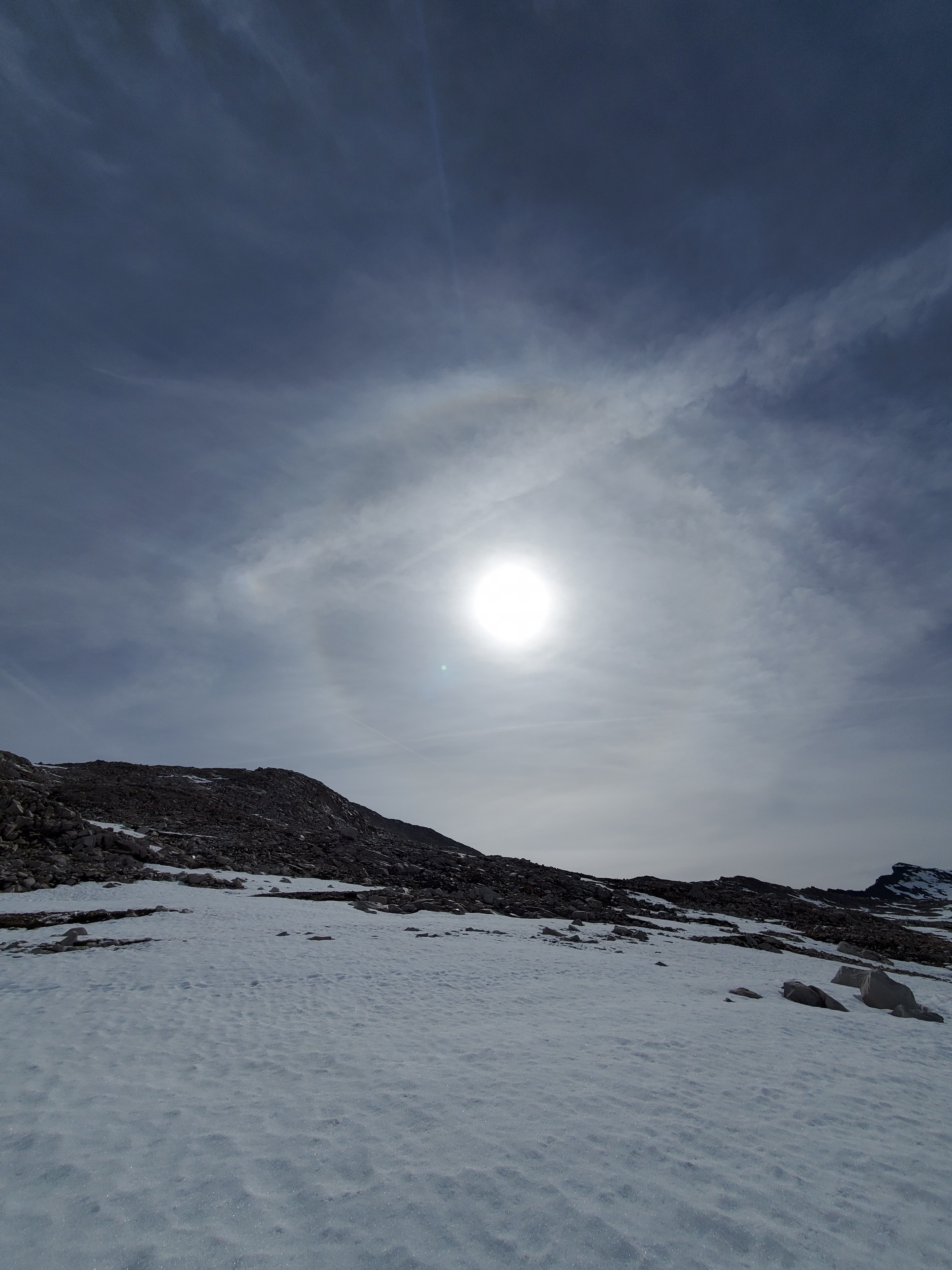 There were some interesting stream crossings, but otherwise it was a fun, easy snow climb on mostly low angle terrain. At the top, a round stone hut stands, the Muir Shelter. There was some cloud cover, a rainbow ring around the sun, and a little bit of wind, so we were happy to take a break in the shelter, protected from the elements. Another hiker, No Breaks, joined us as we were getting ready to head back out. Even he had to take breaks in the Sierras.