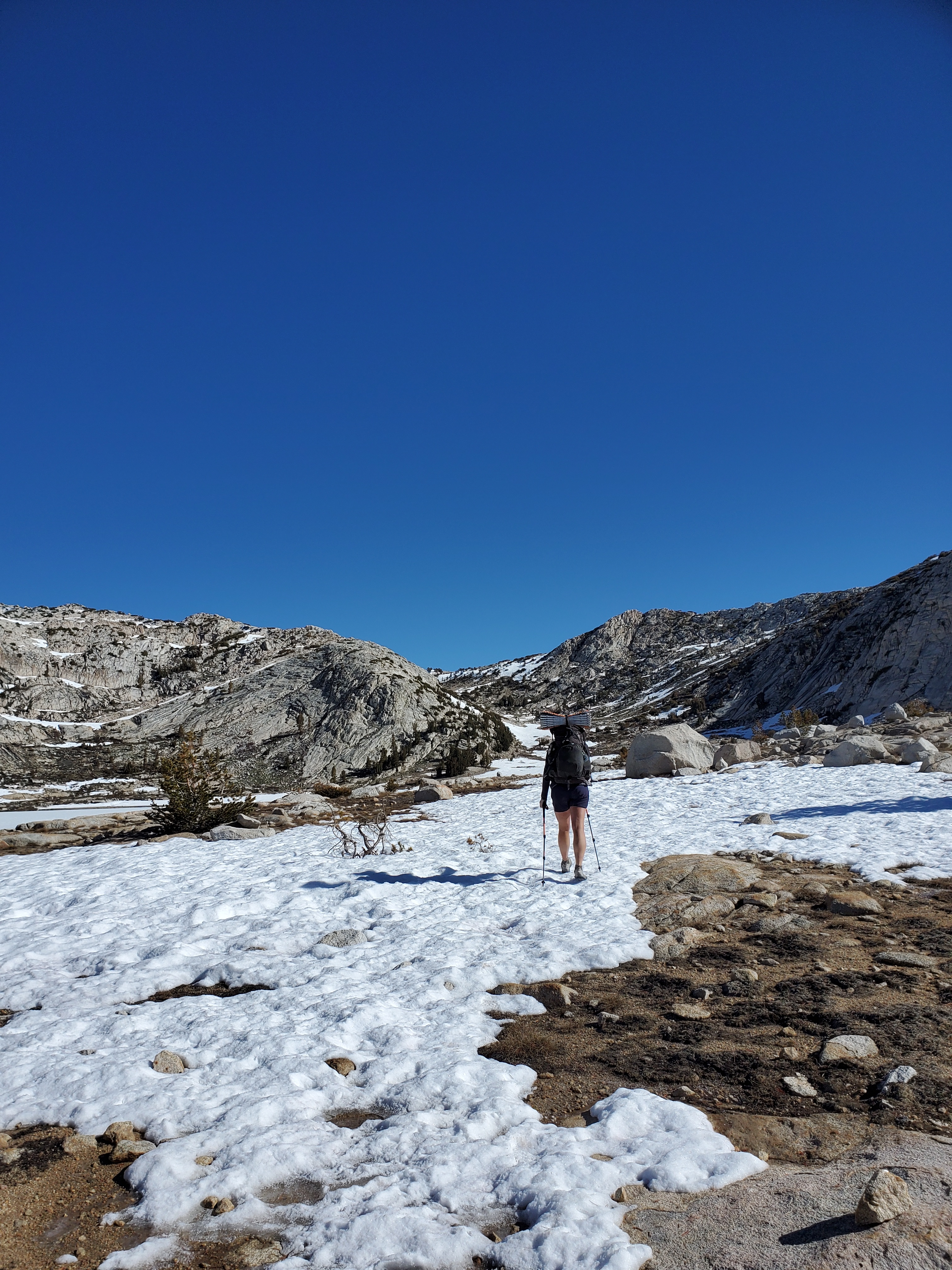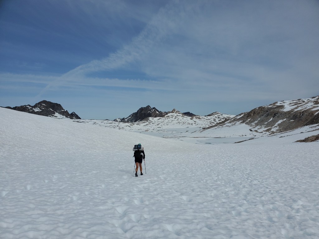 While the most extreme terrain was behind us, we still had a handful of mountain passes to get over in the coming days. Next up was Muir Pass. Again, Maggie and I woke up at 4am and got on trail at 5:55. We had a couple miles of dry trail before the snow started in earnest. Muir Pass had by far the longest continuous stretch of snow to traverse. Waking up early paid off because the snow was solid, and with microspikes on, we were able to make quick work of the climb up the south side of the pass.