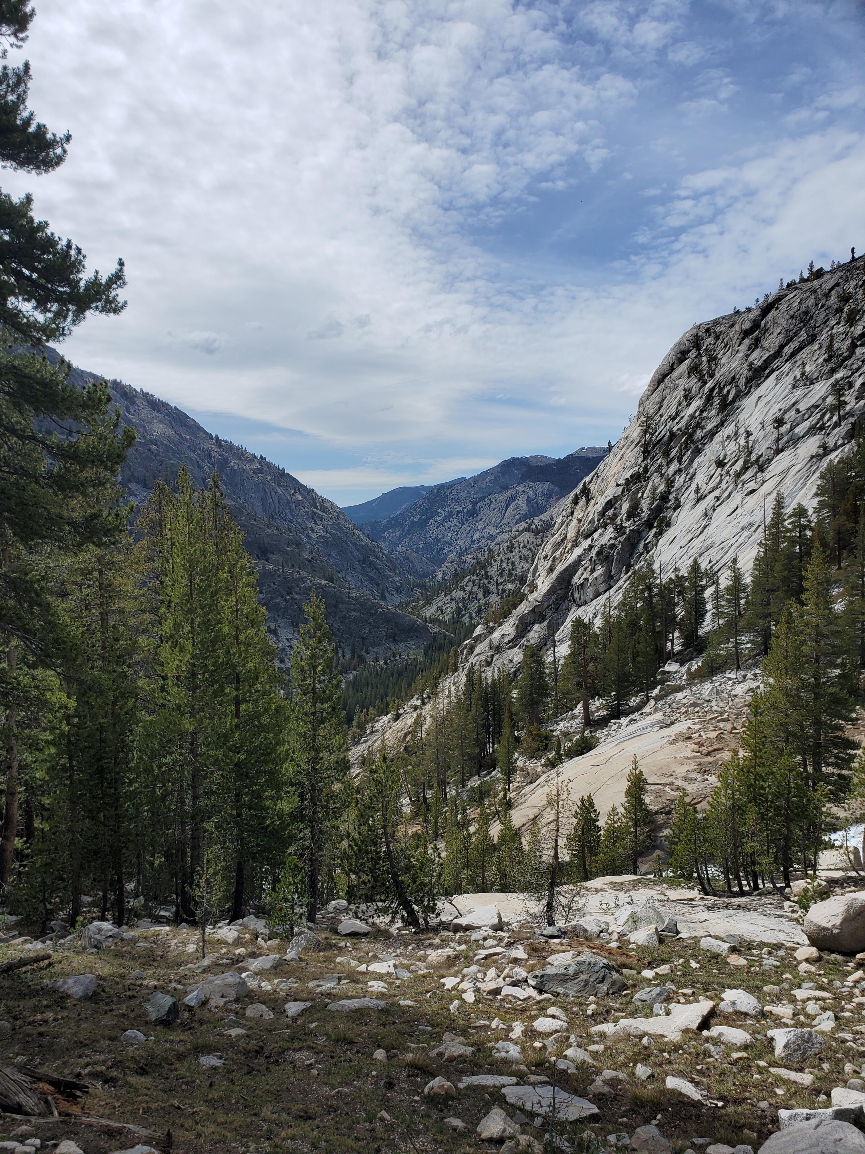 Maggie and I woke up around at 4:30am again. It was an overcast morning, something we hadn’t experienced for a long time. It was honestly a bit strange to not see the colors of the sunrise, just a slowly brightening gray dome. Some light drizzle started to fall as we packed up, making me nervous to climb up to 10,900 feet on Selden Pass, but we were getting near the end of our food and needed to resupply at Vermillion Valley Resort. It was a steep climb right off the bat, but we were feeling pretty good.
