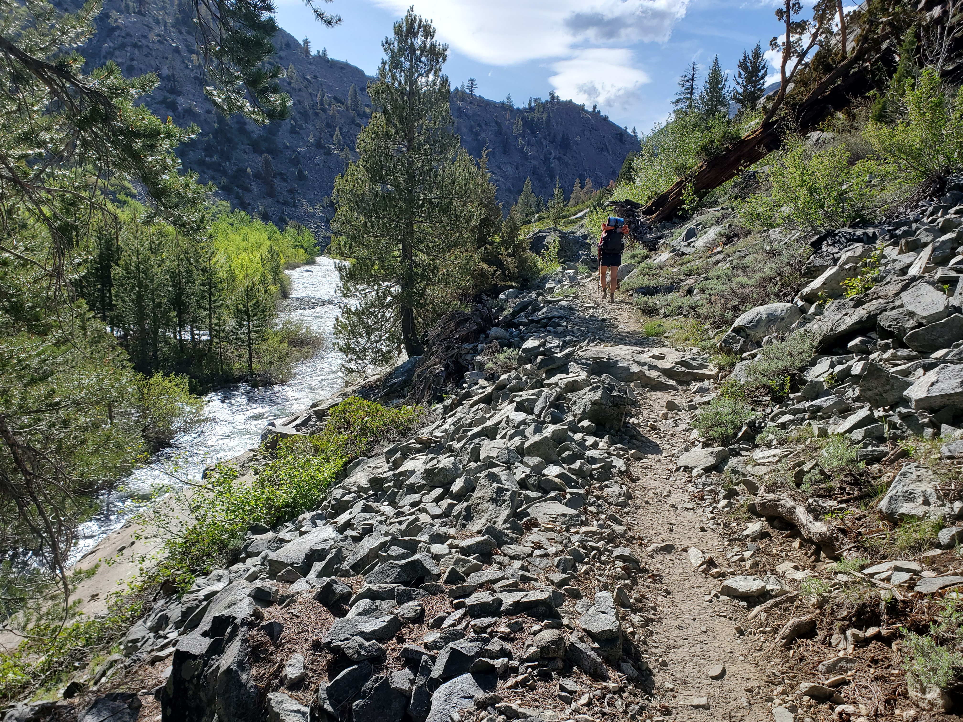 Maggie woke up at 6, I slept in till 8. We stumbled back into the café for breakfast. We filled up on massive breakfast burritos and a fruit bowl, then topped off with a couple pancakes. The food coma setting in, we sat outside in the sun, talking with a few hikers for a bit. We weren’t in a rush since another high pass was up next on the trail, and we certainly weren’t going to tackle it on this day. We bought food for the 2 days to get us to Mammoth Lakes. By the time we organized and packed up, it was already noon. We ate a hiker food lunch before leaving VVR to save a couple bucks, but the café was serving hot sandwiches. We were envious of the hikers who opted for the hot lunch. We finally started walking again, hiking out on the lake trail back to the PCT.