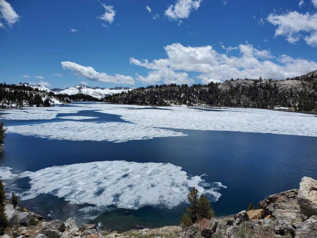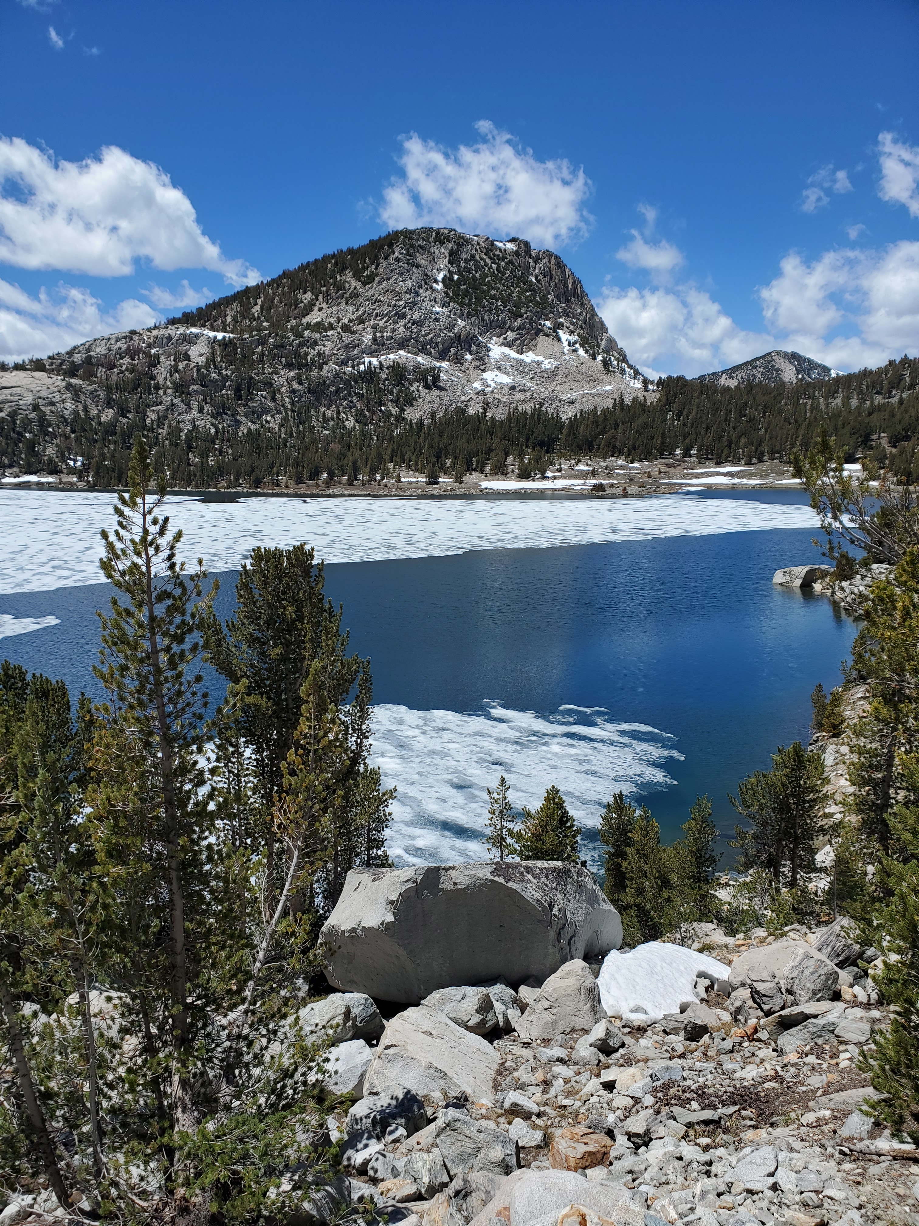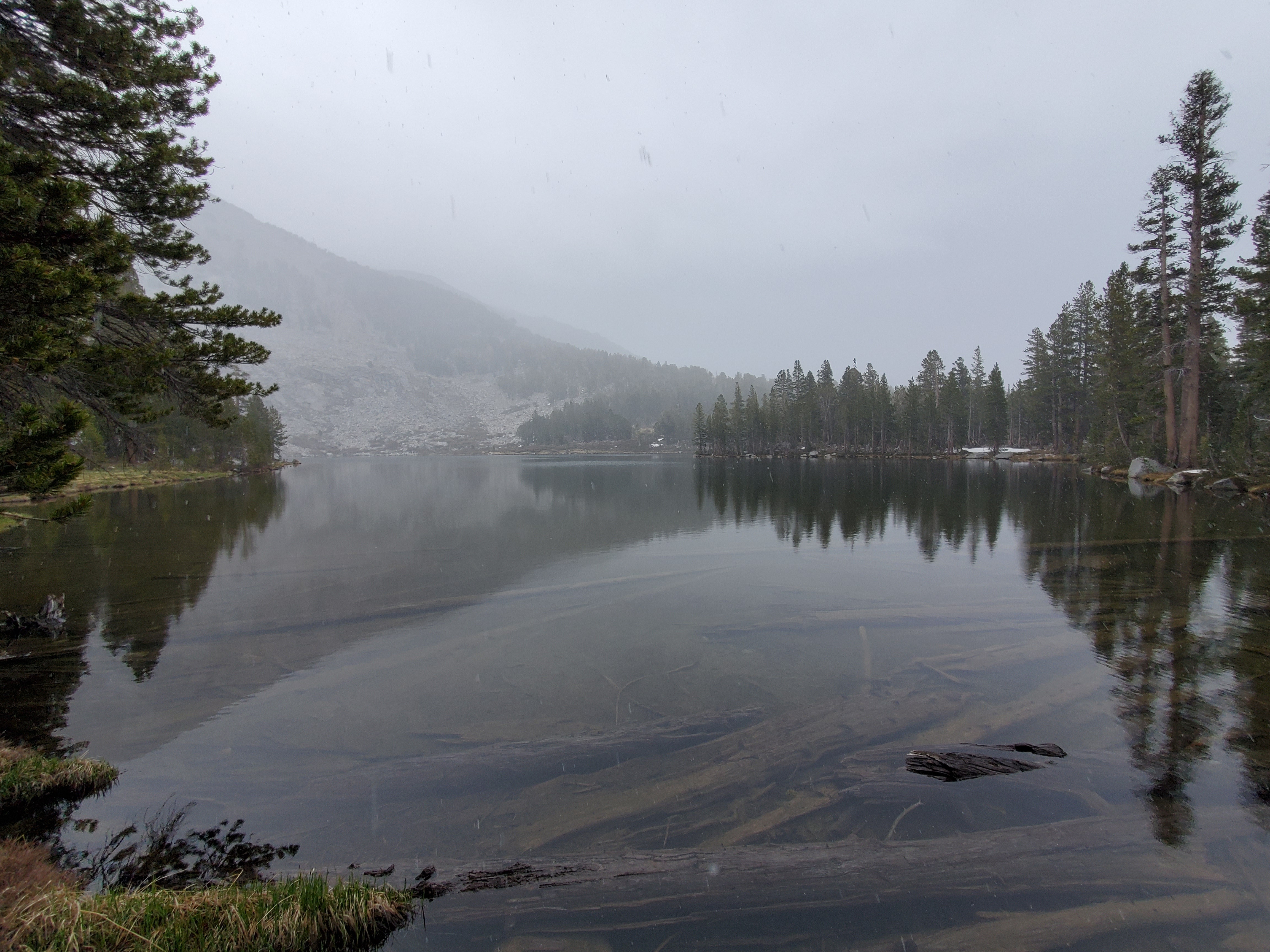 We traversed a bit more snow down the north side of the pass, but it wasn’t too bad. Plodding on down dry trail, we got to Fish Creek, where a bridge spanned the gap over a roaring cascade of water. We went a little further and crossed a log to eat lunch on the other side of the creek. The trail took us up to Virginia Lake, offering some wonderful scenery.