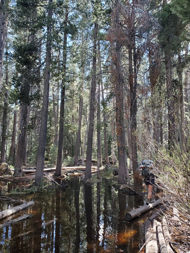 Most everyone sat with us for a snack and to dry out shoes and socks. The drying would end up being futile, as the next stretch of trail had numerous water crossings with no options to keep your feet dry. Just accept the wet feet and keep walking. The trail took us up bear ridge. By now, the clouds cleared up, a complete turn around from the morning snow storm. We made it to our turn off towards VVR, 7 miles off the PCT. Along the long drop back down Bear Ridge, big fir trees stood high overhead. Somewhere in there, we had to cross a swamp. Luckily there were dry logs scattered around and we kept our feet from getting soaked again.