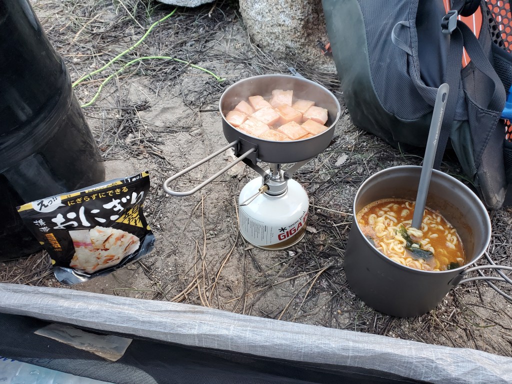 The trail climbed up a little towards Silver Pass. In the last mile, there was a river crossing that required getting your feet wet. We decided to take our shoes off, slap on the Tevas, and we hiked a mile in our sandals to camp. We were done at 5:30pm, feeling refreshed from good food and a short day of hiking. I made ramen for dinner with fried spam and a sea food rice ball on the side, very gourmet for backpacking.