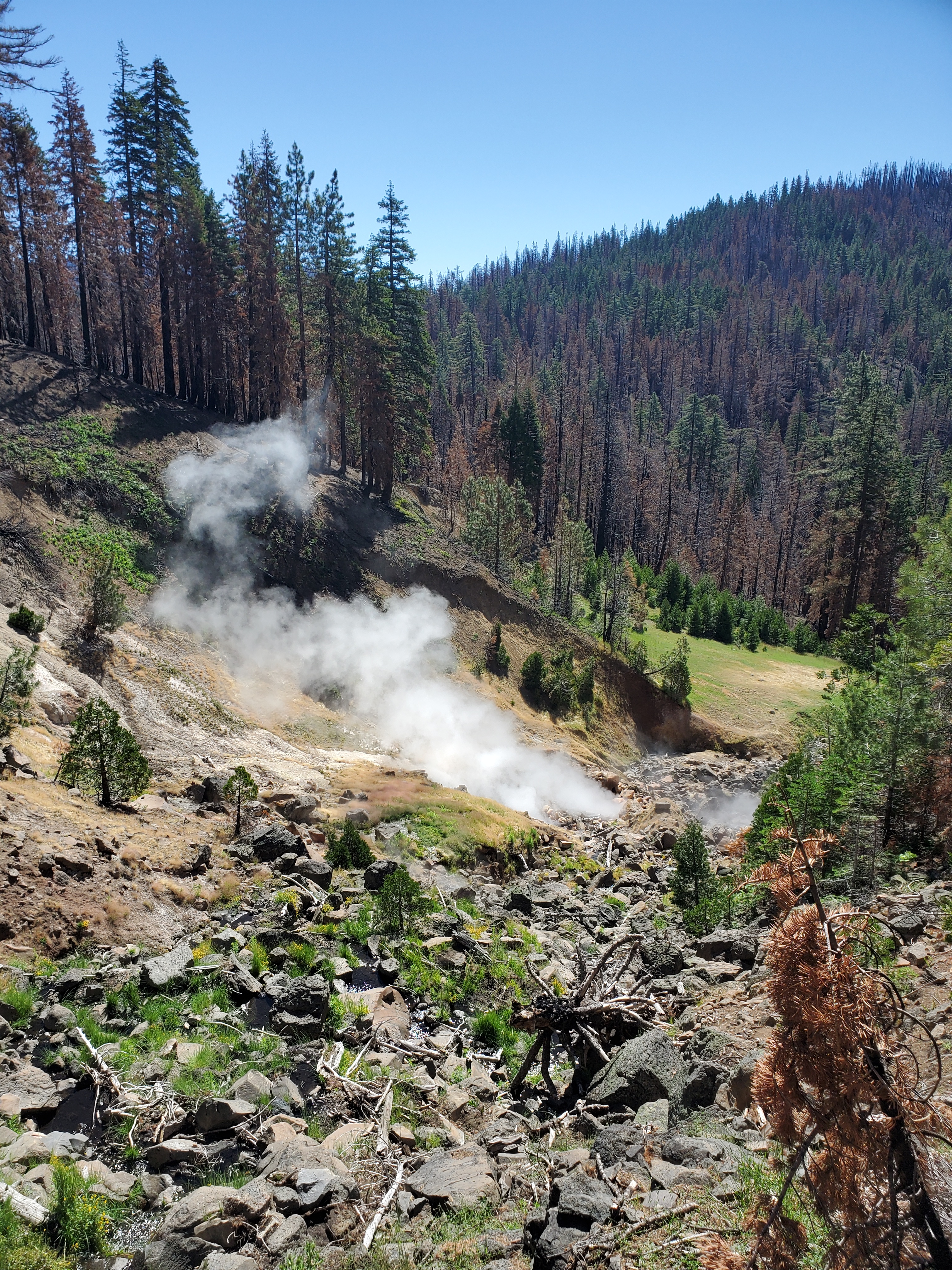 It was a cold morning down by the river. We had to put on warm layers we hadn’t worn in weeks. Maggie and I got moving at 6:50. We quickly returned to burn scar, and that was pretty much the story all day. We entered Lassen National Park, which was almost entire burned in a recent wildfire. We did a short side trail to a “geyser”. This thermal vent boiling water made for a neat little nature break, watching the hot vapor roil in spiraling clouds up through the air.
