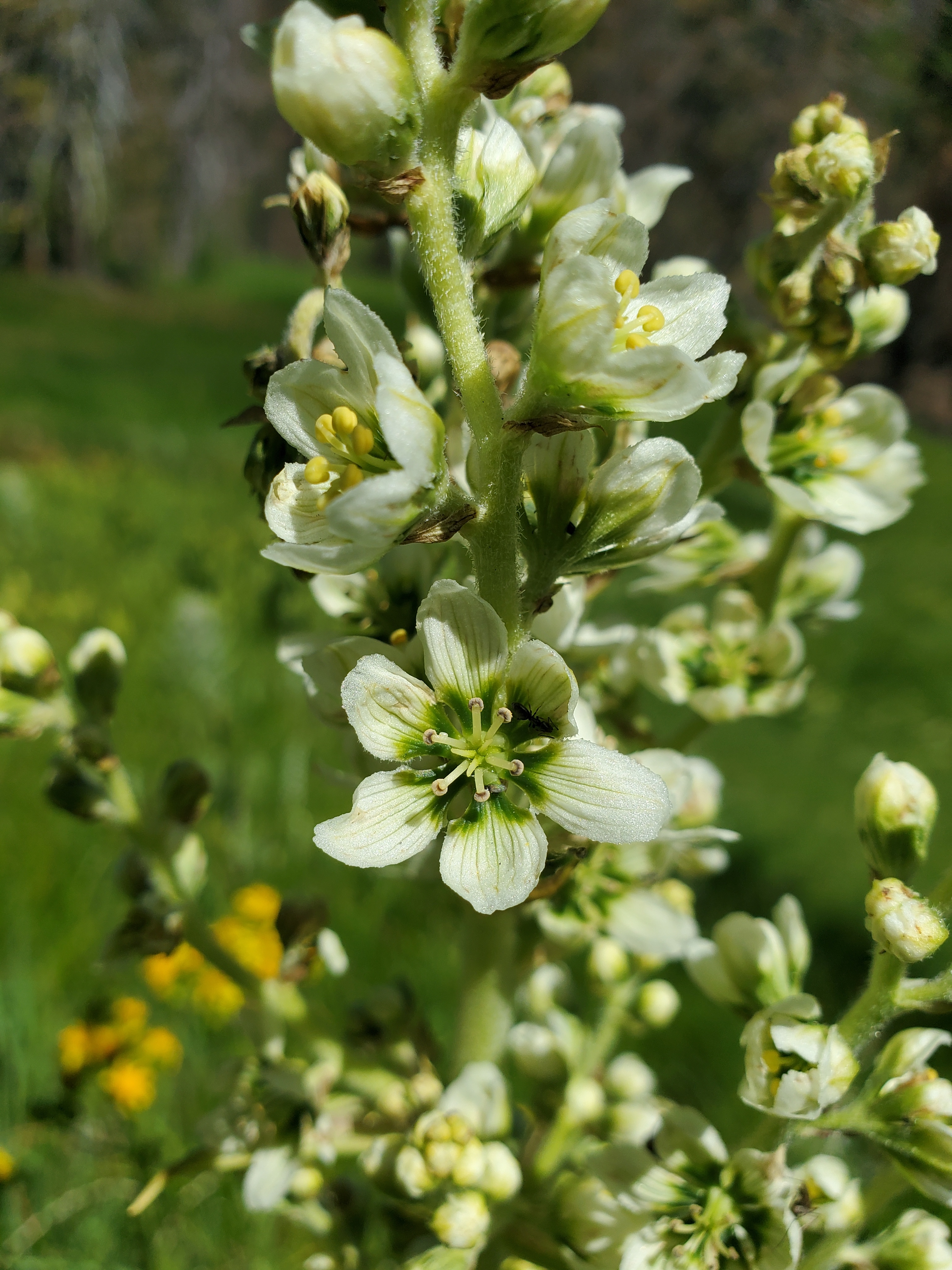 Back on the trail, we walked through very drab charred standing logs, save a few wet meadows in the low drainages. We saw Corn Lily (Veratrum Califorincum) blooming in these wet meadows, a plant common throughout the Rockies as well. I was puzzled for a long time by corn lily – it looks like good eating for herbiverous critters, but I’ve never seen any nibbles on the lucious green leaves. Perhaps it doesn’t come as a surprise that corn lily is toxic, deterring herbivory. Corn lily contains a compound called cyclopamine, which disrupts symmetric growth in embryos. If a pregnant mammal ingests corn lily, it will give birth to a cyclops, which rarely live longer than a few minutes after being born. If you want some nightmare fuel, go ahead and do some further internet searching, but otherwise, I would recommend just enjoying the pretty flowers.
